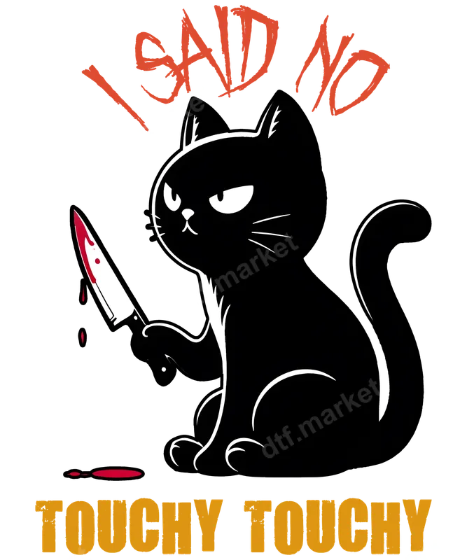 See allThis hilarious and edgy DTF transfer features a grumpy black cat holding a knife, with blood dripping, and the bold text "I SAID NO TOUCHY TOUCHY" in a distressed font. This unique design perfectly captures a sarcastic and slightly menacing vibe, ideal for those who appreciate dark humor and sassy pet expressions. It’s a striking image that promises to turn heads and spark conversations. This ready to press design makes it simple to add personality to your apparel. This design is perfect for cat enthusiasts, fans of funny and sarcastic memes, or anyone with a dry sense of humor. It makes an excellent gift for friends, family, or even yourself, especially for casual wear, quirky events, or just expressing your mood without saying a word. Imagine it on a shirt for a movie night, a casual outing, or as a fun birthday present for that unapproachable cat lover in your life. Applying this high-quality heat transfer is straightforward. It works seamlessly on a wide variety of fabrics including cotton, polyester, and their blends. For best results, use a heat press at 300-325°F for 15 seconds with medium pressure, then cold peel the film. While a heat press is recommended for professional results, this versatile iron on decal can also be applied with a household iron, offering flexibility. Best of all, there's no tedious weeding required, saving you time and effort. Our direct to film transfers are known for their exceptional quality. The colors are incredibly vibrant and will stand out vividly on any garment. Engineered to be durable and crack-resistant, your custom transfer will withstand numerous washes without fading or peeling. The finished design has a soft hand feel, ensuring comfort when worn. Each apparel transfer is produced using professional-grade DTF film with a strong, reliable adhesive for a lasting application.