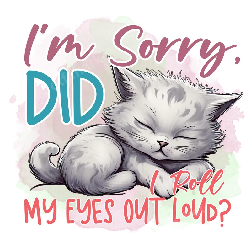 See allThis charming DTF transfer features an adorable, sleepy white kitten, perfectly paired with the hilariously sarcastic phrase, "I'm Sorry, DID I Roll MY EYES OUT LOUD?" The design marries a sweet, innocent visual with a witty, sassy attitude, all set against a subtle, soft watercolor background. It's a fantastic ready to press transfer for anyone who adores cats and possesses a great sense of humor. This unique design is ideal for cat moms, pet owners with a keen sense of humor, or anyone who appreciates a touch of sarcasm in their everyday wear. It makes an excellent gift for birthdays, Mother's Day, or just because, for friends and family who enjoy funny animal designs. Perfect for casual outings, expressing your mood without saying a word, or even as a conversation starter at pet-friendly events. Our premium heat press transfer is incredibly versatile, designed to apply flawlessly onto a wide range of materials, including cotton, polyester, and various fabric blends. For optimal results, use a heat press at 300-325°F for 15 seconds with medium pressure. This high-quality iron on decal can also be applied with a household iron, following included instructions. As a ready to press design, it requires no weeding, making your customization project quick, clean, and effortlessly professional. Experience superior quality with our direct to film transfer products, which boast vibrant, true-to-color prints that resist cracking and peeling, even after multiple washes. The result is a soft-to-the-touch finish that feels like part of the fabric, not a bulky patch. Each apparel transfer is crafted using professional-grade DTF film and strong adhesive, ensuring your custom garments look fantastic and last for years.