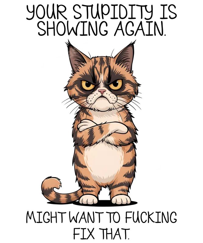 See allUnleash your inner grump with this hilariously blunt DTF transfer, featuring a classic grumpy cat, arms crossed and an annoyed expression. The text boldly declares, 'YOUR STUPIDITY IS SHOWING AGAIN. MIGHT WANT TO FUCKING FIX THAT.' This design captures a sarcastic, edgy vibe, making it a standout choice for anyone appreciating adult humor. It's a premium, ready to press heat transfer for any garment. This sarcastic grumpy cat design is ideal for those with a dry wit, cat owners, or anyone looking to make a bold, funny statement. It’s a fantastic gift for friends who appreciate edgy humor, for casual gatherings, birthdays, or white elephant exchanges. This apparel transfer is sure to get laughs and knowing glances at any social event. Applying this direct to film transfer is straightforward and hassle-free. Our heat press transfer works exceptionally well on cotton, polyester, and various blends. For best results, apply with a heat press at 300-325°F for 15 seconds with medium pressure. Unlike traditional vinyl transfers, there's no weeding required, saving time. You can also achieve great results using a high-quality household iron, making it accessible for everyone to create custom apparel. Experience professional-grade results with our high-quality DTF transfers. This heat press design boasts incredibly vibrant colors and sharp details. Engineered for durability, it's crack-resistant and designed to withstand numerous washes without fading. The transfer is soft to the touch, ensuring comfort on any garment. Each iron on transfer is printed on specialized film with strong adhesive, guaranteeing a long-lasting, professional finish you'll be proud to wear or sell.
