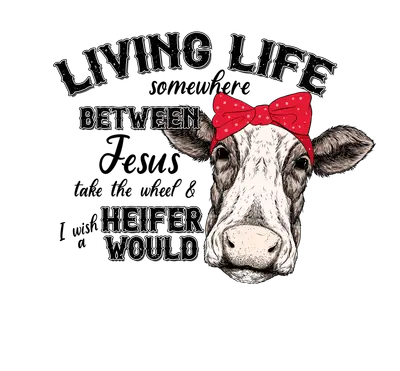See allInject sassy humor into your wardrobe with this hilarious 'Living Life Between Jesus Take the Wheel & I Wish A Heifer Would' DTF transfer. Featuring a detailed, hand-drawn cow wearing a charming red polka dot bandana, this design perfectly captures a playful yet defiant spirit. It’s a full-color, ready to press transfer, guaranteed to spark conversations with its clever blend of faith-based idiom and country sass. This unique iron on transfer is perfect for anyone who loves farm life, has a sharp wit, and a touch of southern charm. Ideal for country music festivals, farmers market regulars, or adding personality to everyday wear. It makes a fantastic gift for sarcastic women, cow lovers, or small boutique owners seeking trendy t-shirt transfer designs. Great for birthdays, Mother's Day, or just to make someone smile. Applying this heat press transfer is a breeze, suitable for crafters and small businesses. It adheres beautifully to cotton, polyester, blends, and even nylon. Use a heat press at 300-325°F for 15 seconds, medium pressure, or a household iron. No weeding required—just peel and press! Create custom t-shirts, cozy hoodies, durable tote bags, fun aprons, or unique pillow covers. For best results, wash inside out and tumble dry low. Our premium heat transfer design ensures vibrant, full-color printing with exceptional detail. You'll love the soft feel, free from the heavy, stiff texture of vinyl transfers. Each direct to film transfer is printed on high-quality DTF film, providing a strong adhesive backing for professional results every time. Elevate your apparel with a durable and eye-catching design that stands the test of time.