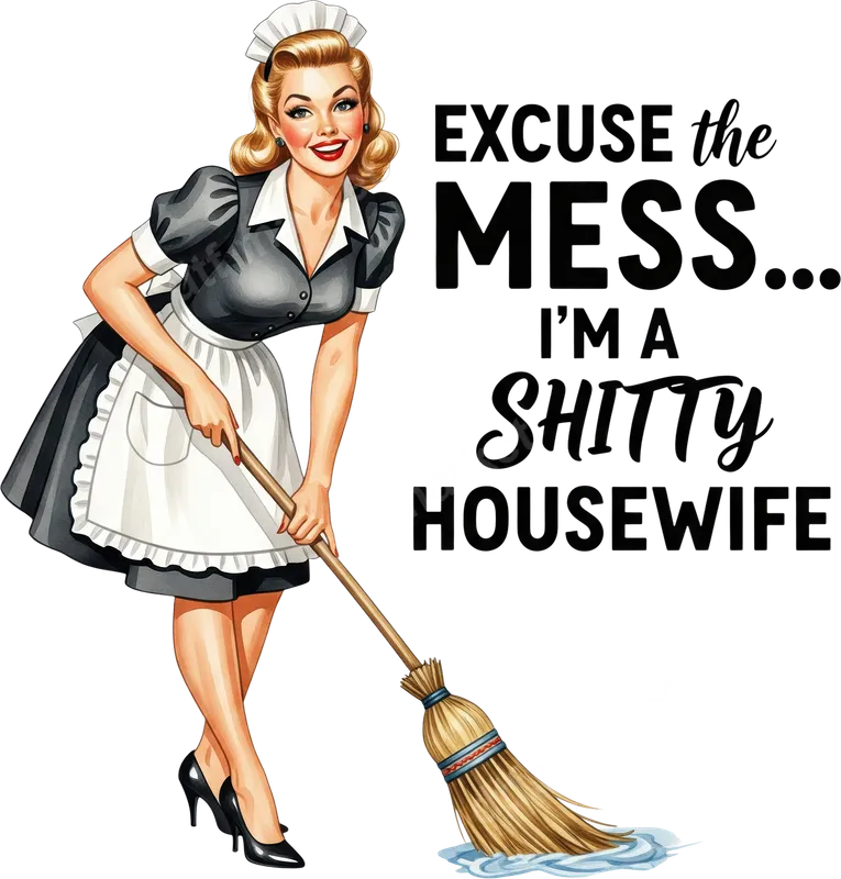 See allInject some retro sass into your wardrobe with this hilarious 'Excuse the Mess... I'm a Shitty Housewife' DTF transfer. This vibrant design features a classic pin-up style maid, broom in hand, with a knowing wink, perfectly capturing the spirit of modern-day homemaking (or lack thereof!). It's a ready to press transfer that combines vintage aesthetics with a bold, contemporary sense of humor, making it an instant conversation starter for any garment. This unique apparel transfer is ideal for anyone who appreciates adult humor, sarcasm, or just isn't afraid to admit their home isn't always magazine-perfect. It makes a fantastic gift for friends, sisters, or moms who embrace their imperfections. Perfect for casual wear, ladies' night out, bachelorette parties, or even as a funny present for a housewarming where the recipient truly understands the joke. Show off your honest-to-goodness (or lack thereof) housekeeping skills with pride! Applying this direct to film transfer is incredibly easy, suitable for both professionals and DIY enthusiasts. Our high-quality heat transfers work flawlessly on a wide range of materials, including cotton, polyester, and their blends. Simply use a heat press at 300-325°F for 15 seconds with medium pressure, or a household iron for smaller applications. Forget about the tedious weeding of vinyl transfers; this ready to press design means you're just moments away from a custom garment. Experience superior quality with our professional DTF film. Each heat press design boasts incredibly vibrant colors that pop, along with exceptional durability. These transfers are crack-resistant, peel-resistant, and remain soft to the touch, ensuring a comfortable wear that lasts wash after wash. Elevate your apparel with a premium iron on transfer that truly stands out and expresses your unique, humorous personality.