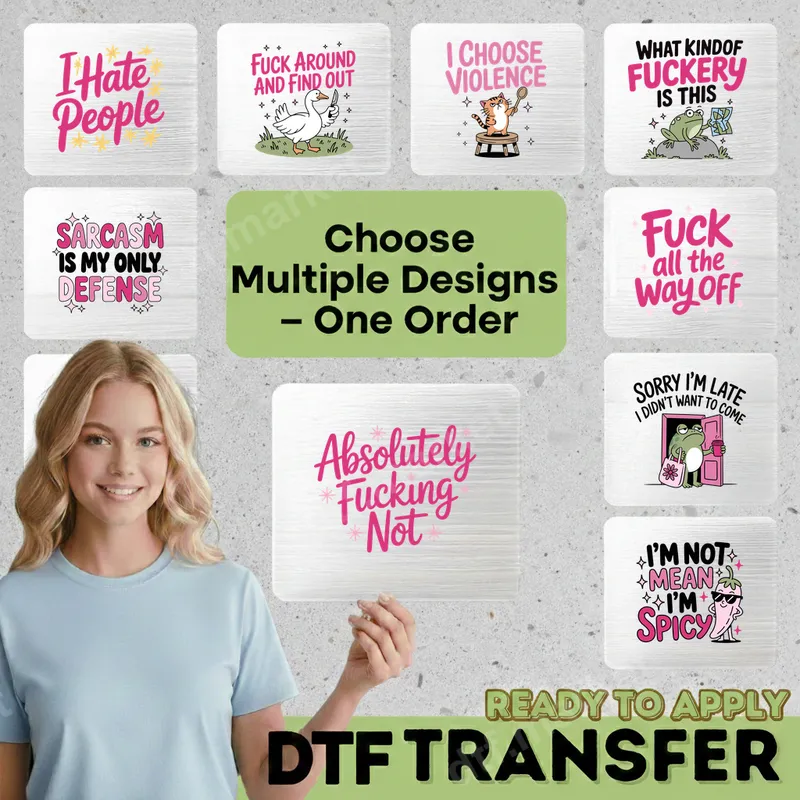 See allUnleash your inner sass with our collection of hilarious and edgy sarcastic humor DTF transfers. Featuring popular phrases like "I Hate People," "Fuck Around And Find Out," and "Absolutely Fucking Not," these direct to film transfers are designed to make a statement. Each ready to press design boasts vibrant colors and crisp details, perfect for adding a touch of bold personality to any garment. These funny DTF transfers are ideal for anyone with a quick wit and a love for pop culture memes. Whether you're gifting to a friend who appreciates adult humor, creating custom apparel for a casual gathering, or simply want to express your unique attitude, these iron on transfers are a perfect choice. Easily transform plain t-shirts, hoodies, or tote bags into conversation starters with these eye-catching iron on decals. Application is simple and efficient. Our heat press transfers work flawlessly on a wide variety of materials, including cotton, polyester, and blends. Achieve professional results using a heat press at 300-325°F for 15 seconds with medium pressure. For those without a heat press, a household iron can also be used. Best of all, there's absolutely no weeding required, making your customization projects quicker and hassle-free to apply. Crafted from premium DTF film, these apparel transfers are not only vibrant but also incredibly durable. Enjoy designs that are crack-resistant, soft to the touch, and built to withstand countless washes. Elevate your wardrobe with a touch of humor and attitude using these high-quality, ready to press transfers that deliver professional-grade results every time.