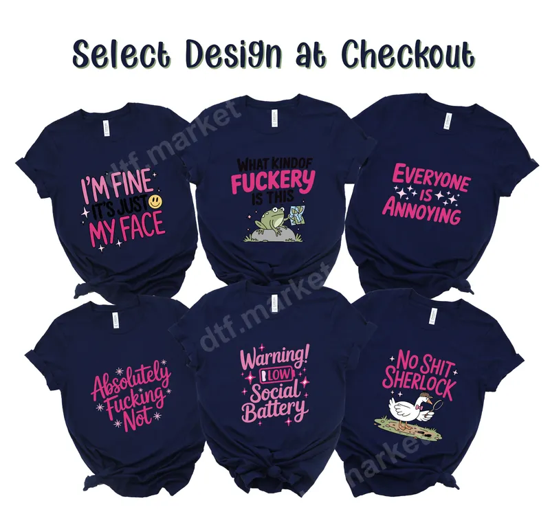 See allDive into our collection of hilariously relatable and sarcastic DTF transfers, designed for anyone who loves a good laugh and isn't afraid to show it. Featuring bold typography and witty phrases like "What Kindof Fuckery Is This" and "Low Social Battery," these direct to film transfers bring an edgy, humorous vibe to any garment. Each design is a ready to press transfer, ensuring a quick and easy application process. These funny heat press transfers are perfect for expressing your personality at casual gatherings, parties, or just adding some flair to your everyday wardrobe. They make fantastic gifts for friends with a dry sense of humor, introverts, or anyone who appreciates a bit of savage wit. Great for birthday presents, white elephant exchanges, or simply a treat for yourself to lighten the mood. Applying your new apparel transfer is a breeze! These high-quality iron on decals work beautifully on a wide range of fabrics including cotton, polyester, and their blends. For best results, use a heat press at 300-325°F for 15 seconds with medium pressure. Alternatively, a household iron can be used with firm, even pressure. No tedious weeding or layering required, making it a truly heat press ready experience. Crafted with professional-grade DTF film, these designs boast vibrant colors and a soft, smooth finish that feels great to the touch. Our durable heat transfers are engineered to be crack-resistant and hold up through countless washes, ensuring your witty statement lasts. Experience the superior quality of a DTF transfer that combines durability with stunning visual appeal.