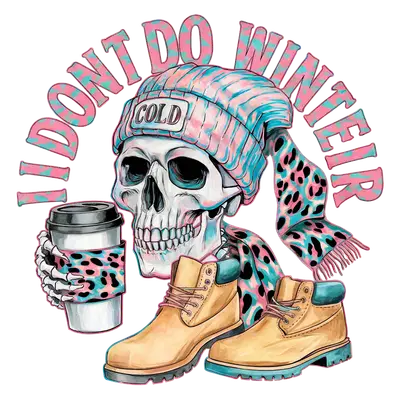 Declare your winter-hating stance with this vibrant 'I Don't Do Winter' DTF transfer. Featuring a cool skeleton sporting a pink and blue beanie (labeled 'COLD'), a matching leopard print scarf, holding a coffee cup, and flanked by stylish work boots, this ready to press design combines edgy style with relatable humor. The crisp details and bright colors make it a standout choice for anyone looking to express their seasonal sentiments with a touch of sarcasm. This design is a perfect iron on transfer for anyone who dreads the colder months, loves coffee, or simply enjoys unique, humorous apparel. It makes a fantastic gift for friends, family, or colleagues who constantly complain about the chill. Small t-shirt businesses and Etsy sellers looking for trending heat transfer designs will find this a popular addition to their winter collections, appealing to a wide range of customers from Gen Z to young adults and beyond. Applying this heat press transfer is simple and efficient. It works beautifully on cotton, polyester, cotton-poly blends, and even nylon fabrics. Achieve professional results using a heat press at 300-325°F for 15 seconds with medium pressure, or apply with a household iron. Forget weeding; these custom t-shirts, hoodies, sweatshirts, tote bags, pillow covers, and denim jackets are ready in minutes. For best durability, wash your garment inside out and tumble dry on low. Each ready to press transfer promises vibrant, full-color printing with exceptional detail, ensuring your design looks stunning. The advanced direct to film transfer technology ensures a crack-resistant, soft-to-the-touch finish without the heavy feel of traditional vinyl. Printed on premium DTF film with a strong adhesive, you'll get professional-grade results that stand the test of time and wear.