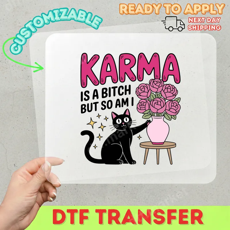 See allThis eye-catching DTF transfer features a confident black cat striking a pose next to a vase of elegant pink roses, all framed by the bold, sassy declaration: "KARMA IS A BITCH BUT SO AM I." The design perfectly blends cute feline charm with a touch of fierce attitude. This high-quality, ready to press heat transfer is perfect for personalizing your apparel and accessories with a statement that won't go unnoticed. Ideal for anyone who loves cats, sarcastic humor, or expressing their feisty side, this design makes a fantastic gift for friends, sisters, or anyone with a strong personality. Perfect for birthday presents, bachelorette parties, or simply to add a touch of personality to your everyday wardrobe. It’s a great conversation starter and an empowering statement piece for those who believe in cosmic justice. Our direct to film transfers are incredibly versatile and easy to apply. They work flawlessly on a wide range of materials, including 100% cotton, 100% polyester, and cotton/poly blends. Application is simple with a heat press at 300-325°F for 15 seconds with medium pressure, or even a household iron following specific instructions, making it a fantastic iron on transfer. Enjoy a professional finish without the hassle of weeding, making it a true ready-to-press transfer experience. Crafted with professional-grade DTF film and strong adhesive, this heat press design ensures vibrant colors and exceptional durability. The print is crack-resistant, incredibly soft to the touch, and designed to withstand numerous washes, maintaining its vividness and integrity. Our apparel transfers offer a premium, long-lasting customization solution for all your creative projects.