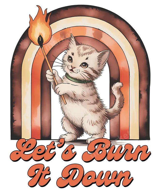 See allThis unique DTF transfer features an adorably mischievous kitten, complete with a tiny green collar, holding a boldly lit matchstick. Behind the cute culprit, a rustic, retro-style rainbow in warm shades of brown, orange, and cream adds a vintage touch. Below the playful feline, the phrase "Let's Burn It Down" is emblazoned in a groovy, distressed orange font, creating a delightfully ironic and edgy statement. This heat press ready design is perfect for adding a touch of rebellious charm to any garment. Ideal for cat lovers with a sassy sense of humor, Gen Z trendsetters, and anyone who appreciates a good ironic meme, this design makes an unforgettable statement. It's a fantastic gift idea for birthdays, casual everyday wear, or just a fun way to express a playful, rebellious spirit. Perfect for friends who love quirky animal designs and sarcastic one-liners. Applying this vibrant apparel transfer is simple and requires no weeding. It works beautifully on a wide range of fabrics including cotton, polyester, and their blends. For best results, use a heat press at 300-325°F for 15 seconds with medium pressure, then perform a cool peel. For those without a professional heat press, a household iron can also be used with careful application. Crafted using professional-grade DTF film, this iron on transfer boasts exceptional quality. The colors are incredibly vibrant, crack-resistant, and the design remains soft to the touch, ensuring comfort and durability. This ready to press transfer provides a high-quality finish that will last, making it an excellent choice for custom t-shirt transfers and more.
