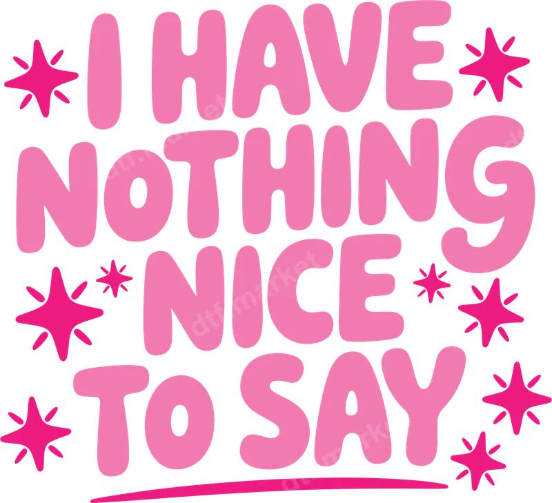 See allThis vibrant pink "I Have Nothing Nice To Say" DTF transfer is a bold statement piece for anyone with a playful, sarcastic sense of humor. Featuring chunky, bubbly typography and playful starburst accents, this eye-catching design is perfect for expressing your mood without uttering a word. As a ready to press transfer, it's designed for effortless application, allowing you to instantly transform any garment. Ideal for friends who appreciate witty banter, or as a fun gift for someone who isn't afraid to be a little blunt. This unique heat press design is perfect for casual wear, social gatherings, or simply adding a touch of humor to your everyday wardrobe. It's a great choice for birthday presents, white elephant exchanges, or just a treat for yourself when you need a little sass in your life. Our premium DTF transfers are incredibly versatile, adhering beautifully to a wide range of fabrics including cotton, polyester, and various blends. Applying your new iron on transfer is simple with a heat press, requiring approximately 300-325°F for 15 seconds with medium pressure. Unlike traditional vinyl transfer options, there's absolutely no weeding required, making customization quick and hassle-free. Experience professional-grade quality with every print. These direct to film transfers boast vibrant colors that pop, superior stretch and crack resistance, and a soft-to-touch feel that integrates seamlessly with your fabric. Made with durable DTF film and a strong adhesive, your new apparel transfer will stand up to countless washes and wears, maintaining its sharp look.