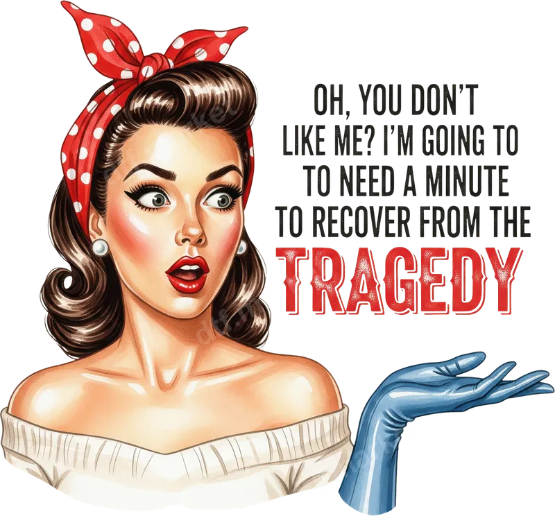 See allUnleash your inner sass with this eye-catching DTF transfer featuring a classic retro pin-up girl. Her exaggerated, shocked expression perfectly complements the witty, sarcastic quote: "OH, YOU DON'T LIKE ME? I'M GOING TO NEED A MINUTE TO RECOVER FROM THE TRAGEDY." This vibrant, ready to press design is a perfect way to add some vintage humor to your wardrobe or craft projects. This design is ideal for anyone who loves retro aesthetics, sarcastic humor, or making a bold statement. It's a fantastic gift idea for friends with a sassy attitude, a fun addition to a girls' night out outfit, or just for personal expression on casual days. Perfect for birthdays, holiday gatherings, or simply to show off your confident personality. Applying this heat transfer is incredibly easy, working seamlessly with cotton, polyester, and various fabric blends. You can use a professional heat press (300-325°F for 15 seconds with medium pressure) or a household iron. Unlike traditional vinyl transfers, there's no tedious weeding required, making your customization process quick and hassle-free. Our professional DTF film ensures a high-quality, durable, and crack-resistant finish. The colors remain vibrant wash after wash, and the transfer feels soft to the touch, not stiff or heavy. This premium apparel transfer offers a long-lasting, professional look that will make your garments stand out and your message clear.