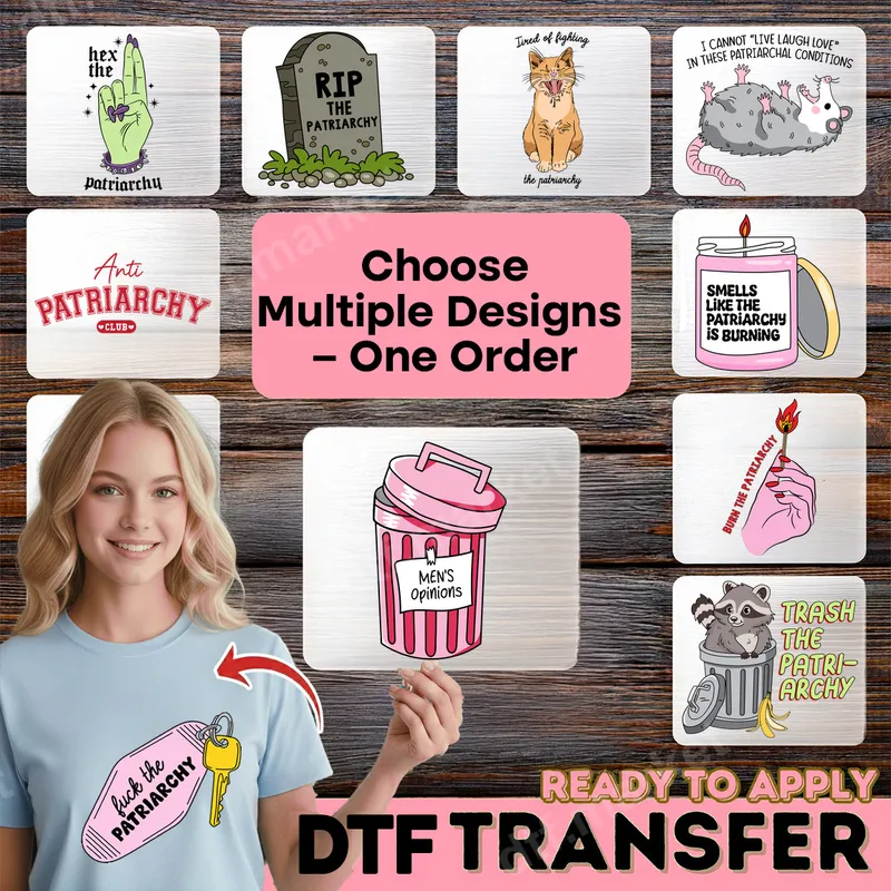 See allThis vibrant collection of anti-patriarchy DTF transfers offers a bold and humorous way to express your feminist views. Each ready-to-press design, from "RIP The Patriarchy" gravestones to "Men's Opinions" in a trash can and "Hex the Patriarchy" hand gestures, embodies a sassy attitude perfect for making a statement. These high-quality direct to film transfers are crafted to bring your apparel to life with sharp details and vivid colors, celebrating female empowerment and social justice. Perfect for feminists, Gen Z activists, and anyone passionate about equality, these unique designs make fantastic statements for casual wear, protests, rallies, or even as thoughtful, funny gifts for friends who share your values. Whether you're attending a march, having a girls' night, or just want to add some empowering humor to your everyday style, these heat press designs are for you. They’re a fun way to wear your heart on your sleeve and spark conversations. Applying these iron on transfers is incredibly simple and requires no weeding. They work seamlessly on cotton, polyester, and all poly/cotton blends. For best results, use a heat press at 300-325°F for 15 seconds with medium pressure, then perform a cool peel. A household iron can also be used with firm, even pressure. Detailed instructions are included to ensure a perfect custom transfer, making your application process smooth and professional. Our professional-grade DTF film ensures durability and a soft feel, unlike traditional vinyl transfers. Each shirt design boasts excellent wash fastness, remaining crack-resistant and vibrant through countless cycles. You'll love the smooth finish and how these apparel transfers integrate into the fabric, providing a long-lasting, comfortable, and eye-catching addition to your wardrobe.