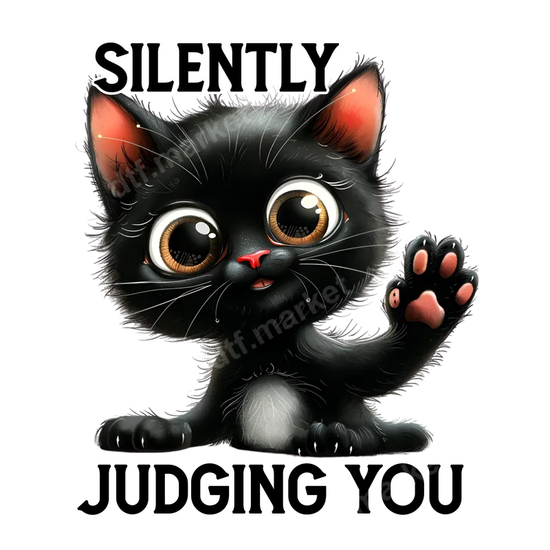 See allThis adorable yet hilariously sassy DTF transfer features a fluffy black cat with wide, expressive eyes, a tiny pink nose, and an uplifted paw, accompanied by the bold text "SILENTLY JUDGING YOU." It's the perfect design for anyone who appreciates a bit of understated humor and the mysterious ways of feline companions. This high-quality DTF transfer is vibrant, detailed, and completely ready to press onto your favorite garments. Ideal for cat owners, pet lovers, and those with a sarcastic sense of humor, this design makes a fantastic gift or a fun addition to your personal wardrobe. Wear it to casual gatherings, cat-themed events, or simply when you want to make a subtle statement about your discerning taste. It’s also a perfect choice for introverts who communicate best through their apparel, adding a touch of playful judgment to any outfit. Applying this iron on transfer is incredibly simple. Designed for a smooth heat press application (recommended 300-325°F for 15 seconds with medium pressure), it adheres beautifully to cotton, polyester, and various fabric blends. Unlike traditional vinyl transfer designs, there's no tedious weeding required, making custom apparel creation faster and easier than ever. You'll have a professional-looking garment in minutes. Our professional heat transfer ensures a vibrant, long-lasting print that is soft to the touch, crack-resistant, and durable through countless washes. This premium t-shirt transfer maintains its color and detail, making it an excellent choice for crafting unique apparel transfer items that truly stand out. Enjoy a professional finish with every application.