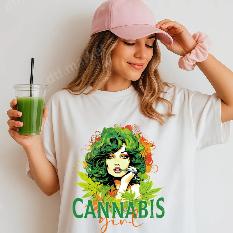 See allThis striking DTF transfer features a sassy 'Cannabis Girl' design, with a vibrant, green-haired woman holding a joint, surrounded by colorful swirls and iconic cannabis leaves. The bold graphic, complete with "CANNABIS girl" text, exudes a confident and expressive vibe, making it a perfect ready to press statement piece for anyone who celebrates the 420 culture. This high-quality direct to film transfer is designed to bring your apparel to life with stunning detail and color. Ideal for cannabis enthusiasts, festival-goers, or anyone looking to add a unique, edgy touch to their wardrobe, this heat press transfer makes an excellent gift for friends who appreciate alternative styles or want to showcase their personality. Perfect for 4/20 celebrations, casual wear, or creating custom merchandise for a relaxed, fun-loving audience, this shirt design is sure to turn heads. Applying this vibrant iron on decal is incredibly simple, making it accessible for both beginners and experienced crafters. Our DTF transfers work beautifully on a wide range of fabrics, including cotton, polyester, and various blends. For best results, use a heat press at 300-325°F for 15 seconds with medium pressure, followed by a cool peel. No complicated weeding is required, saving you time and effort to create your perfect custom transfer. Crafted using premium DTF film and professional-grade inks, this apparel transfer ensures exceptionally vibrant colors, sharp details, and a finish that is soft to the touch. Our heat press ready designs are crack-resistant and durable, designed to withstand numerous washes without fading or peeling, ensuring your custom garment looks great for years to come. Enjoy a professional quality finish with every application.
