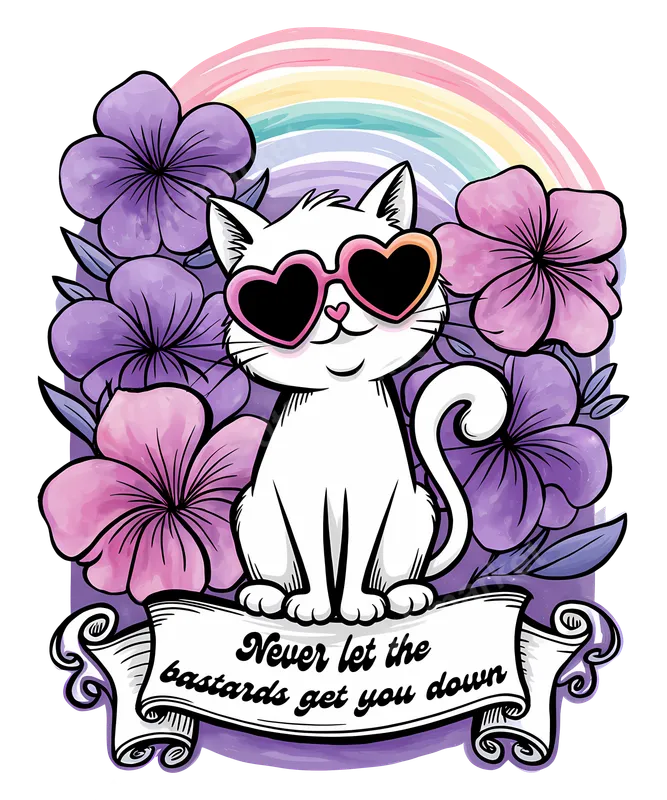 See allDive into pure sass with this vibrant DTF transfer featuring an irresistibly cool white cat. Sporting stylish pink heart-shaped sunglasses, the feline sits gracefully amidst a backdrop of lush purple and pink watercolor flowers and a pastel rainbow arc. A powerful message unfurls on a banner below: "Never let the bastards get you down," making this design a perfect blend of charm and defiance. This ready to press design is expertly crafted for effortless application onto your favorite apparel. This unique iron on transfer is ideal for anyone who loves cats, embraces a sarcastic wit, or needs a daily dose of empowering humor. It makes a fantastic gift for friends, sisters, or mothers who appreciate a good laugh and a strong message. Perfect for casual wear, weekend outings, or simply adding a touch of bold personality to your wardrobe, this shirt design is sure to turn heads and spark conversations. Applying this heat press transfer is a breeze, suitable for cotton, polyester, and most fabric blends. For best results, use a heat press at 300-325°F for 15 seconds with medium pressure, then peel cold. You can even use a household iron for smaller designs, following similar temperature guidelines. The beauty of a direct to film transfer is that there's no weeding required, saving you time and effort. Crafted with professional-grade DTF film and strong adhesive, this apparel transfer promises exceptional durability and a brilliant finish. The colors are incredibly vibrant, crack-resistant, and offer a soft, smooth feel on any garment. Enjoy a high-quality, long-lasting iron on decal that maintains its integrity wash after wash, delivering a professional look every time.