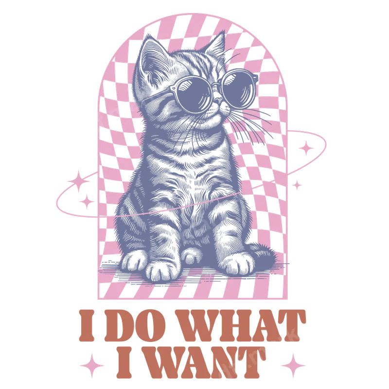 See allThis vibrant DTF transfer showcases a stylish, finely detailed kitten sporting cool sunglasses, all set against a chic pink checkerboard arch. Below the confident feline, the phrase "I DO WHAT I WANT" is boldly displayed in a retro-inspired, warm brown font, accented by twinkling stars. This design perfectly embodies a sassy, independent spirit with playful charm and a nostalgic Y2K aesthetic. It's a premium, ready to press DTF transfer, ideal for adding instant personality to your favorite items. Perfect for cat lovers, independent thinkers, or anyone who appreciates humor and retro style, this heat press transfer makes a fantastic statement piece. It's excellent for personalizing everyday wear, creating unique gifts, or adding a fun touch to custom apparel for casual outings or expressing your unique mood. Surprise a beloved cat mom, a rebellious teen, or a friend with a strong personality with this playful design. Our high-quality direct to film transfer is incredibly easy to apply, working seamlessly on a wide range of fabrics including cotton, polyester, and various blends. Achieve professional results using a heat press set at 300-325°F for 15 seconds with medium pressure, or even with a household iron. There's no weeding or complex layering required; this iron on decal comes heat press ready, allowing you to create custom apparel effortlessly. Experience superior durability and a vibrant, crisp finish with every application. Our DTF transfers are crafted from professional-grade film, ensuring colors remain true and resist cracking or fading even after multiple washes. The strong adhesive provides a soft, comfortable feel on garments, making your finished product look and feel premium. Transform your shirts, hoodies, tote bags, and more with this durable and eye-catching apparel transfer.