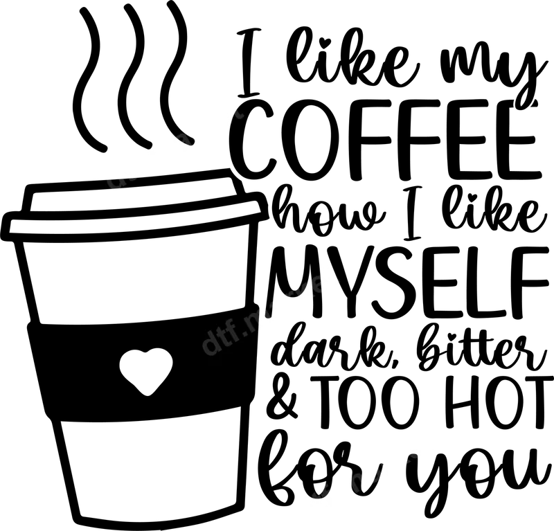 See allThis bold and humorous DTF transfer features a steaming coffee cup alongside the witty phrase, "I like my COFFEE how I like MYSELF dark, bitter & TOO HOT for you." The design combines a clean illustration with a mix of playful script and strong sans-serif fonts, creating an eye-catching statement piece. It's a premium direct to film transfer, professionally printed and completely ready to press onto your favorite apparel. This ready to press transfer is perfect for anyone with a strong personality and a deep love for coffee. Ideal for coffee enthusiasts, sarcastic individuals, or anyone who enjoys a good laugh, this heat transfer makes a fantastic personalized item. It's perfect for casual wear, coffee shop visits, work-from-home attire, or as a unique gift for friends, family, or coworkers on birthdays, holidays, or just because. Show off your confidence and sense of humor with this fun iron on transfer design, sure to spark conversations wherever you go. Applying this high-quality shirt design is incredibly easy. Our DTF transfers work flawlessly on a wide variety of materials, including cotton, polyester, cotton/poly blends, and even denim. Simply use a heat press at 300-325°F for 15 seconds with medium pressure, then cool peel. For home users, a household iron can also be used with firm, even pressure. Best of all, there's no weeding or masking required, saving you time and effort for a professional finish every time. Experience superior quality with our vibrant, full-color DTF apparel transfers. Each transfer is designed to be highly durable, offering excellent washability without cracking or fading. The soft-touch feel ensures maximum comfort once applied to your garment, making it feel like part of the fabric. Our professional DTF film features a strong adhesive, guaranteeing a long-lasting, retail-quality finish for your custom creations.