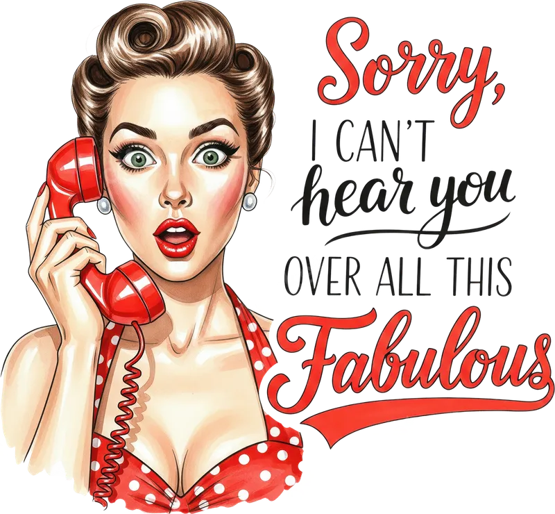 See allThis eye-catching DTF transfer features a glamorous, surprised pin-up woman holding a classic red telephone, paired with the witty phrase "Sorry, I CAN'T hear you OVER ALL THIS Fabulous." The vibrant, retro-inspired artwork captures a bold and confident attitude, making this direct to film transfer a standout choice for adding personality to any garment. It's a completely ready to press design, eliminating the need for complex preparation. This sassy heat transfer is perfect for anyone who loves vintage aesthetics, pop culture, and expressing their inner diva. It makes an ideal gift for birthdays, Mother's Day, or simply to celebrate a friend's fabulousness. Easily create custom apparel, personalized tote bags, or unique gifts with this fun iron on transfer that speaks volumes without you saying a word. Applying this high-quality iron on decal is simple and efficient. It works seamlessly on a wide range of fabric types, including cotton, polyester, and various blends. For best results, use a heat press at 300-325°F for 15 seconds with medium pressure, then cool peel. A household iron can also be used, making it accessible for everyone. Best of all, there's absolutely no weeding required, saving you time and effort. Crafted using premium DTF film and inks, this t-shirt transfer boasts exceptional durability and vivid color reproduction. The design is engineered to be crack-resistant, peel-resistant, and incredibly soft to the touch, ensuring a professional finish that lasts wash after wash. Transform ordinary items into extraordinary pieces with this long-lasting and vibrant apparel transfer, reflecting your fabulous style.
