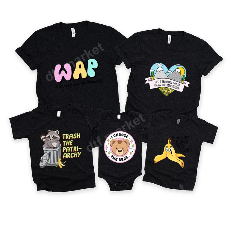 See allDiscover our collection of five bold and humorous DTF transfers, perfect for expressing your unique style. Featuring the playful "WAP Women Against The Patriarchy," the spirited "Smash the Patriarchy" mountain heart, and the rebellious "Trash The Patriarchy" raccoon. Also find the charming "I Choose The Bear" and the witty "Clumsy around fragile masculinity" banana peel designs, offering a ready to press option for every statement. These versatile heat press designs are ideal for feminists, activists, and anyone who loves witty, empowering messages. Perfect for rallies, casual wear, or thoughtful gifts. Whether for International Women's Day, a community event, or just adding personality, these iron on transfers will spark conversations. Applying these high-quality apparel transfers is easy and efficient. Our DTF transfers work on cotton, polyester, and blends. For best results, use a heat press at 300-325°F for 15 seconds, cold peel, then press again for 5 seconds. A household iron can also be used. Best of all, no tedious weeding is required for these custom transfers! Experience superior quality with our professional-grade DTF film. Each t-shirt transfer boasts vibrant colors and sharp details. Designed for durability, these crack-resistant designs maintain their integrity wash after wash. The finished heat transfer offers a soft, lightweight feel, providing comfort without compromising impact. Enjoy a durable, long-lasting graphic for truly exceptional custom creations.