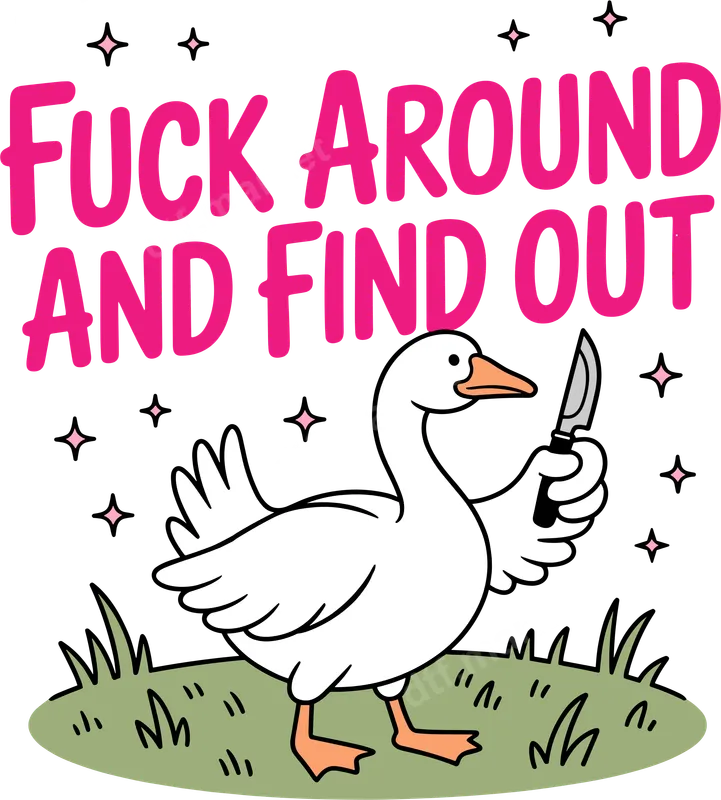 See allThis bold and humorous DTF transfer features a confident white goose holding a small, sharp knife, accompanied by the unmistakable phrase "F*** AROUND AND FIND OUT" in vibrant pink lettering. Small, sparkling stars add a touch of playful menace to this unique design. It's a perfect statement piece for those who appreciate edgy humor and aren't afraid to express their sassy side. This high-quality direct to film transfer is ready to press onto your favorite garments. Ideal for individuals with a sharp wit and a love for internet culture or viral memes. This design makes a fantastic conversation starter for casual wear, parties, or social gatherings. It's an excellent gift for friends who enjoy sarcastic humor, an edgy addition to a personal wardrobe, or a standout design for a group event where a touch of attitude is welcome. Perfect for anyone wanting to add a humorous, slightly rebellious touch to their apparel. Applying this heat press transfer is incredibly simple, making it accessible for both experienced crafters and beginners. Our professional-grade iron on transfer works seamlessly on a wide variety of fabrics, including 100% cotton, polyester, and popular cotton/poly blends. For best results, use a heat press at 300-325°F for 15 seconds with medium pressure. A household iron can also be used with careful application. Enjoy the convenience of a ready-to-press design with absolutely no weeding required. Experience superior quality with every print. Our DTF transfers boast incredibly vibrant colors that stand out and are designed for excellent durability. The professional-grade film ensures a soft touch feel, avoiding the thick, plasticky texture of traditional vinyl transfer options. Expect a crack-resistant, peel-resistant finish that holds up wash after wash, thanks to the strong adhesive backing. This apparel transfer delivers professional results right at home.