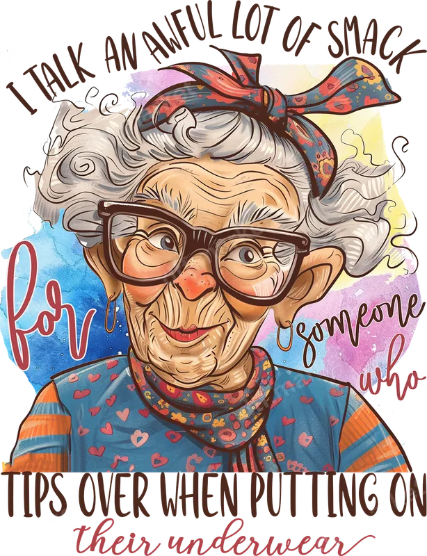 See allThis vibrant DTF transfer features a charmingly sassy grandma, complete with stylish glasses and a colorful headscarf, delivering a hilariously self-aware quote: "I TALK AN AWFUL LOT OF SMACK for SOMEONE WHO TIPS OVER WHEN PUTTING ON their UNDERWEAR." Set against whimsical watercolor splashes, this ready to press design perfectly captures a playful, witty spirit, making it an instant conversation starter. It's a high-quality heat transfer ready for immediate application. Perfect for anyone with a great sense of humor, this design makes an ideal t-shirt transfer for grandmas, aunts, or any woman who embraces aging with a witty attitude. It's a fantastic gift idea for Mother's Day, birthdays, Christmas, or just a fun way to celebrate family gatherings. Imagine the smiles this humorous apparel transfer will bring when applied to a favorite tee or sweatshirt. Applying this heat press transfer is incredibly simple. It works flawlessly on a wide range of fabrics including 100% cotton, polyester, and various blends. Use a heat press at 300-325°F for 15 seconds with medium pressure, then peel cold. For home crafters, a household iron on its highest setting with firm, even pressure can also achieve great results. No more tedious weeding like vinyl; this iron on transfer is ready in minutes. Experience professional quality with this direct to film transfer. Crafted using premium DTF film and vibrant, durable inks, your finished garment will boast incredible detail and rich colors that resist cracking and fading. The transfer is soft to the touch, ensuring comfort on any garment. This robust iron on decal provides long-lasting wear, making it a favorite addition to any wardrobe.