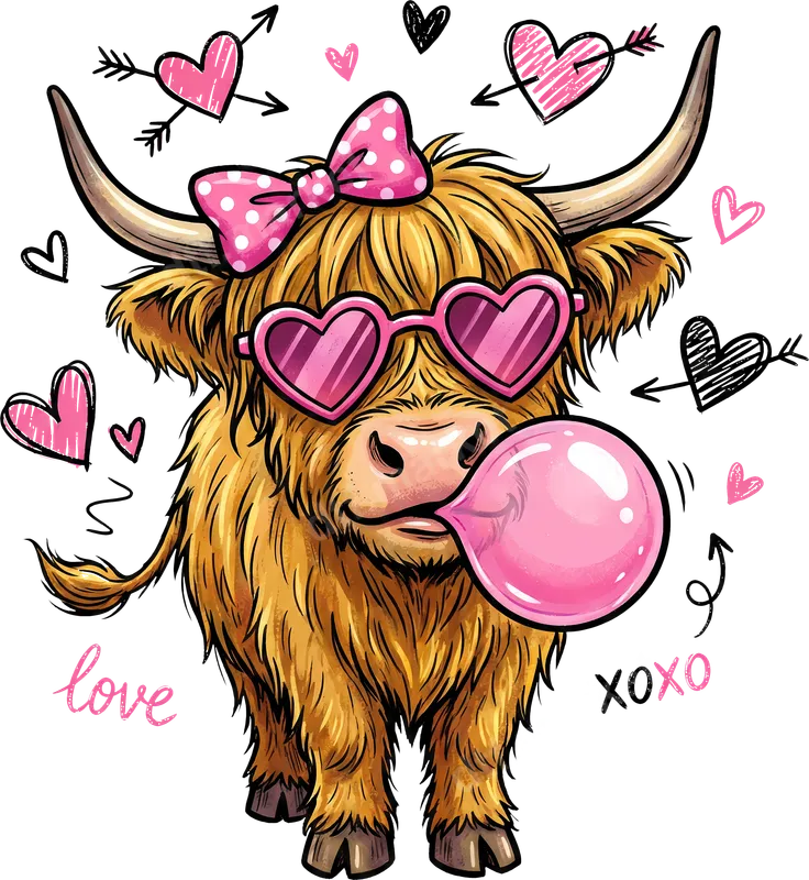 Sassy Highland Cow Valentine DTF Transfer - Heart Glasses & Bubblegum