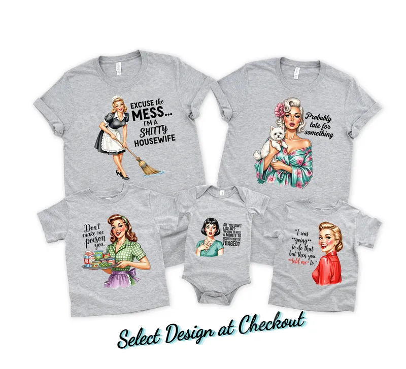 See allThis hilarious DTF transfer features a retro pin-up style maid looking disheveled yet glamorous, alongside the witty text: 'Excuse the mess... I'm a shitty housewife.' It captures a blend of vintage charm and modern, relatable humor, making it a standout design for anyone embracing their perfectly imperfect life. This ready to press transfer is designed to bring smiles and knowing nods. Ideal for moms, homemakers, or anyone with a busy lifestyle and a great sense of humor, this heat press design makes a fantastic gift for Mother's Day, birthdays, or just because. It’s perfect for creating custom apparel for casual outings, family gatherings, or even just lounging around the house. Showcase your sassy attitude and embrace the chaos with this unique shirt design. Applying this direct to film transfer is effortless, suitable for cotton, polyester, and various fabric blends. For best results, use a heat press at 300-325°F for 15 seconds with medium pressure, then peel cold. If you don't have a heat press, a household iron can also be used with careful application. Unlike vinyl transfers, there's no tedious weeding required, ensuring a professional-looking finish quickly. Our premium DTF transfers boast exceptional quality, ensuring vibrant colors that pop and a durable, crack-resistant finish that withstands countless washes. The design feels soft to the touch, seamlessly blending with the fabric. Crafted using professional-grade DTF film with strong adhesive, this apparel transfer promises longevity and a high-quality look that will impress.