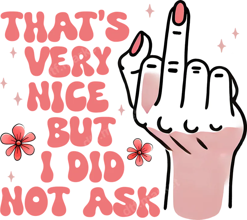 See allUnleash your inner sass with this eye-catching "That's Very Nice But I Did Not Ask" DTF transfer. Featuring a stylized hand giving the middle finger alongside the iconic phrase in a groovy, retro pink font, this design is the ultimate statement piece. It's a vibrant, ready to press DTF transfer that captures a playful yet unapologetic attitude, adorned with subtle stars and flowers for a touch of charm. This heat transfer is perfect for those with a bold sense of humor, anyone who appreciates sarcastic wit, or friends looking for a unique gag gift. Ideal for Gen Z, young adults, or anyone wanting to make a clear statement without saying a word. Elevate your everyday wardrobe or create custom apparel for social gatherings, birthdays, or just because you feel like it. Applying this durable heat press transfer is simple and efficient. It works beautifully on a wide variety of materials, including cotton, polyester, and blends. For best results, use a heat press at 300-325°F for 15 seconds with medium pressure, then peel cold. You can also achieve great results with a household iron, making it accessible for everyone. Best of all, there’s absolutely no weeding required, saving you time and effort. Crafted with professional-grade DTF film, this iron on transfer offers exceptional quality. The colors are incredibly vibrant and remain crack-resistant even after multiple washes, ensuring your design looks fresh for longer. The transfer feels soft to the touch, seamlessly integrating into your garment, and boasts a strong adhesive for lasting wear. This t-shirt transfer is designed for a professional finish every time.