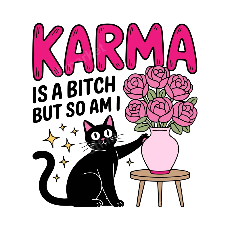 See allThis vibrant and humorous DTF transfer features a charming black cat next to a vase of elegant pink roses, accompanied by the bold declaration, "KARMA IS A BITCH BUT SO AM I". The design perfectly blends playful feline charm with a touch of sassy attitude, making it an ideal statement piece. This high-quality direct to film transfer is ready to press, bringing instant personality to any garment or accessory. Perfect for cat lovers with a strong sense of humor, this design makes an excellent gift for friends who appreciate a witty saying and cute aesthetics. It's suitable for casual wear, social gatherings, or simply expressing your independent spirit. Ideal for birthdays, gifting a fellow cat mom, or adding a unique touch to your everyday wardrobe. Applying this heat press transfer is simple and efficient. It adheres beautifully to a wide range of materials, including cotton, polyester, and various fabric blends. For best results, use a heat press at 300-325°F for 15 seconds with medium pressure. A household iron can also be used with care. Enjoy the convenience of a ready to press transfer with no tedious weeding required. Our iron on transfers are crafted using professional-grade DTF film and inks, ensuring exceptional vibrancy and durability. The colors pop, the design is crack-resistant, and the finished print is incredibly soft to the touch, seamlessly blending with the fabric. This premium t-shirt transfer delivers a professional, long-lasting finish that stands up to countless washes.