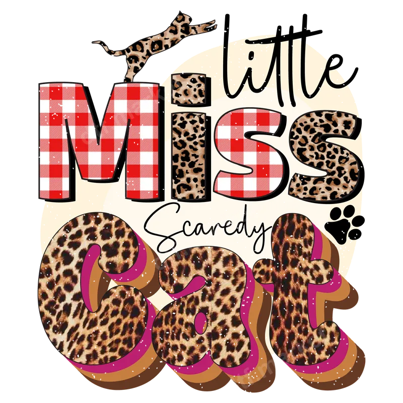 See allThis playful DTF transfer features 'little MISS Scaredy Cat' in a vibrant, mixed-pattern design. 'MISS' pops with classic red and white gingham, while 'little', 'Scaredy', and 'Cat' boast trendy leopard print. A dynamic leopard-spotted cat silhouette leaps above, accompanied by a cute paw print, all set against a subtle distressed background. This eye-catching ready to press transfer adds sassy charm to any garment. Ideal for cat lovers, playful personalities, or anyone who enjoys humor and unique style. This heat press design makes a fantastic personalized gift for friends or family. Perfect for casual wear, weekend outings, or as a fun conversation starter, it's suitable for all ages. Whether feeling timid or just loving a good pun, this design captures that 'scaredy cat' spirit with flair. Applying this direct to film transfer is effortless. It adheres beautifully to cotton, polyester, and blends. For best results, use a heat press at 300-325°F for 15 seconds with medium pressure. Unlike vinyl transfer sheets, our DTF transfers require no weeding, making customization quick. You can even use a household iron for smaller projects, ensuring a smooth, professional finish. Experience superior quality with our professionally printed apparel transfer. Our DTF transfers boast vibrant colors, crisp details, and exceptional durability, resisting cracks and peeling. The finish is soft to the touch, seamlessly integrating with the fabric for maximum comfort. Each heat transfer is produced using premium DTF film and strong adhesive for long-lasting, eye-catching custom creations.