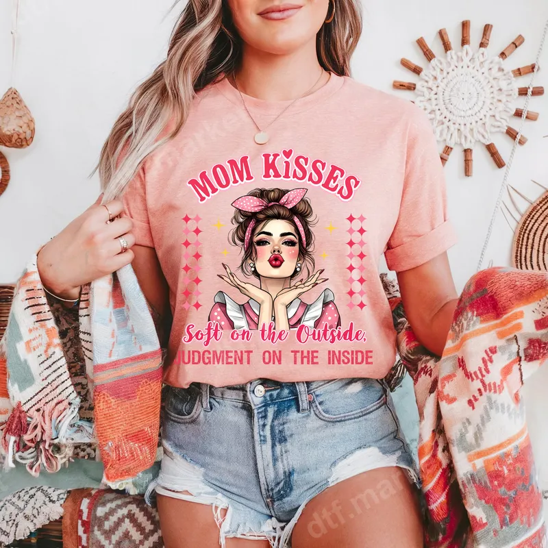 See allThis vibrant DTF transfer features a sassy, cartoon-style mom character with a messy bun and a playful kissy face, framed by sparkling pink diamonds. The bold text "MOM KISSES Soft on the Outside, JUDGMENT ON THE INSIDE" perfectly captures the humorous and relatable duality of motherhood. It’s a ready to press design that embodies playful sarcasm and a strong mom attitude, making it an eye-catching statement piece. This unique heat transfer is tailor-made for mothers who love to express their personality with a touch of wit and sass. It’s an ideal gift for Mother's Day, birthdays, Christmas, or simply to celebrate the everyday humor of mom life. Perfect for friends, sisters, or any parent who appreciates a good laugh and isn't afraid to show their "judgmental" side playfully. Our direct to film transfer ensures easy application on a wide range of fabrics, including cotton, polyester, and blends. For best results, use a heat press at 300-325°F for 15 seconds with medium pressure, then cold peel. Alternatively, this versatile apparel transfer can also be applied with a household iron, following included instructions. Enjoy hassle-free customization with no weeding required. Experience premium quality with our professional-grade DTF transfer. This heat press design boasts incredibly vibrant colors that pop, superior crack-resistance, and a soft-to-touch finish that feels great on any garment. Printed on durable DTF film with a strong, lasting adhesive, these iron on decals are built to withstand washes and wear, ensuring your custom transfer looks fantastic for a long time.