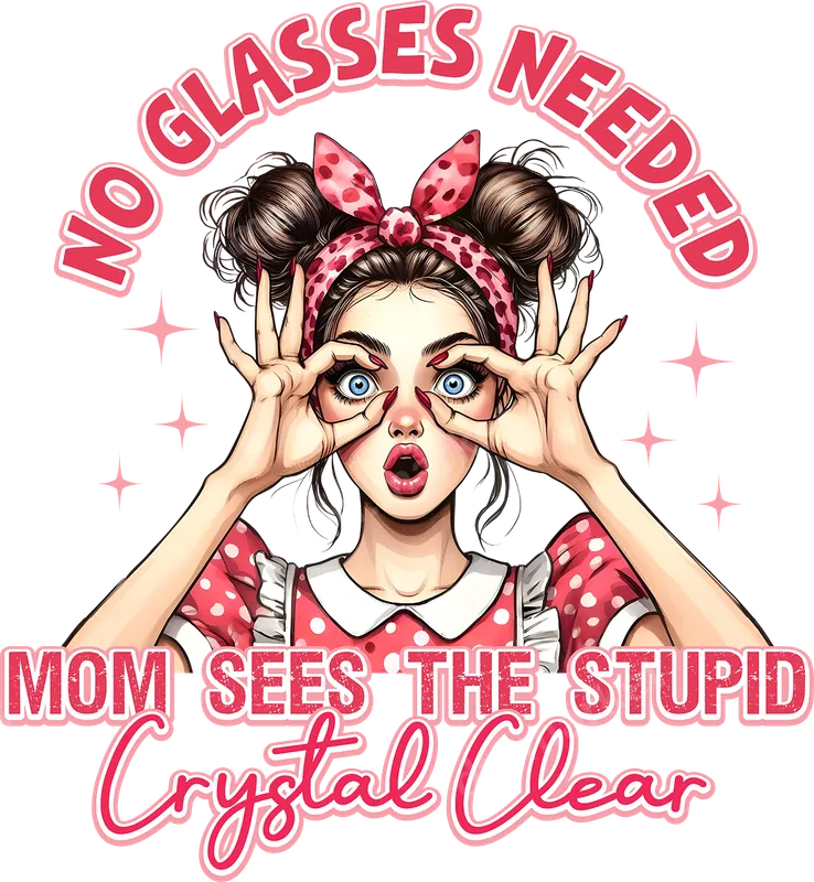 See allThis vibrant and hilarious DTF transfer features a retro-style character making "glasses" with her hands, accompanied by the witty text: "NO GLASSES NEEDED MOM SEES THE STUPID Crystal Clear." It captures the humorous reality of motherhood with a sassy, playful vibe. This high-quality direct to film transfer is ready to press, bringing instant personality to any garment. This design is perfect for any mom who appreciates a good laugh and isn't afraid to show her true feelings about daily "stupid." It's an ideal gift for Mother's Day, birthdays, or just because, for your favorite strong, sassy, and discerning mother. Great for school events, family gatherings, or casual outings where a touch of humor is always welcome. Applying this ready to press transfer is incredibly easy. Our heat press transfer adheres beautifully to cotton, polyester, and blends. For best results, use a heat press at 300-325°F for 15 seconds with medium pressure. It can also be applied with a household iron. No weeding or layering needed, making customization simple and quick. Experience professional-grade results with our durable heat press designs. Each iron on transfer boasts vibrant colors, superior stretchability, and excellent wash fastness, ensuring your design remains crack-resistant and soft to the touch. Our premium DTF film uses a strong adhesive, ensuring a long-lasting, high-quality finish on all apparel projects.