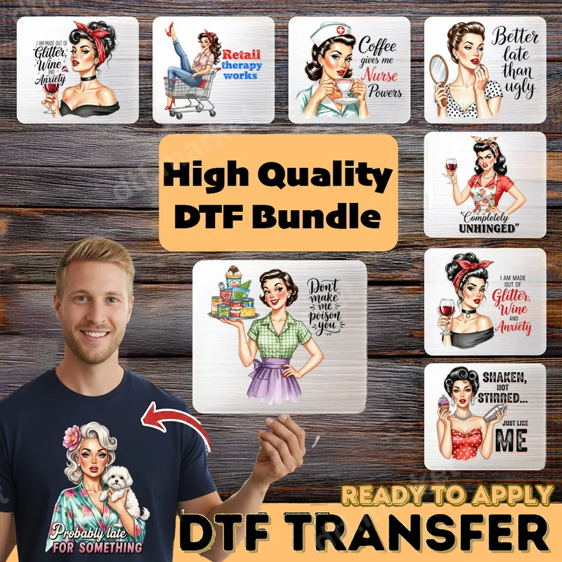 See allDive into a world of retro charm and witty humor with this vibrant pin-up girl DTF transfer bundle. Each high-quality direct to film transfer features a classic pin-up character paired with a relatable, sassy quote, perfect for adding personality to any garment. From the "Glitter, Wine And Anxiety" diva to the "Better Late Than Ugly" beauty and the "Probably Late For Something" darling, these designs are ready to press and sure to make a statement. This collection is ideal for women who love to express their fun, confident, and sometimes sarcastic side. They make fantastic gifts for birthdays, bachelorette parties, girls' nights out, or just because! Crafters, small business owners, and anyone looking to create custom apparel will find these designs perfect for unique t-shirts, tank tops, and sweatshirts that stand out. Applying these heat press transfers is incredibly easy, making them suitable for both beginners and experienced users. Our heat press ready transfers work beautifully on a wide range of fabrics, including cotton, polyester, and various blends. For best results, use a heat press at 300-325°F for 15 seconds with medium pressure, then cold peel. A household iron can also be used with careful application. Best of all, there's no weeding required! Experience superior quality with every iron on transfer. Our DTF transfers boast vibrant, true-to-color prints that resist cracking and fading, ensuring your custom shirt design looks great wash after wash. The professional-grade DTF film provides a soft hand feel and strong adhesive, guaranteeing a long-lasting, durable apparel transfer that feels like part of the fabric.
