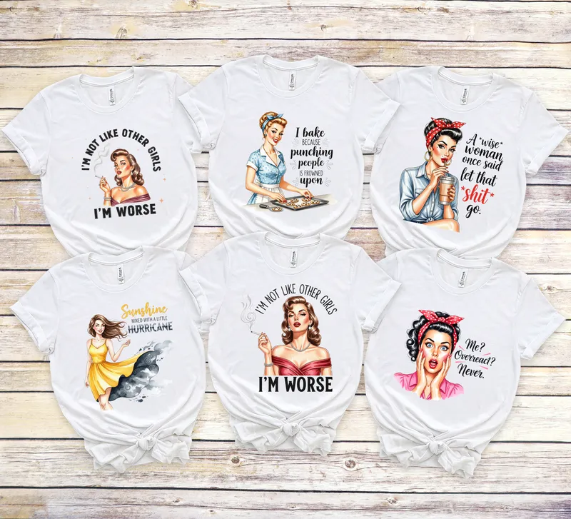 See allInject vintage charm and cheeky humor into your wardrobe with our Sassy Pin-Up Girl DTF Transfer collection. These vibrant direct to film transfers feature classic retro artwork of glamorous women paired with hilarious, attitude-filled quotes like 'I'm Not Like Other Girls, I'm Worse.' Each design offers a unique blend of old-school cool and modern wit, perfect for expressing your personality. These heat press ready designs ensure a professional finish, letting you create custom apparel effortlessly. These funny iron on transfers are ideal for anyone who loves retro aesthetics, pop culture, and a good laugh. Perfect for gifting to a best friend, sister, or mom on birthdays, Mother's Day, or just because. They're excellent for adding a personalized touch to casual outfits, making a statement at social gatherings, or creating unique presents for fellow sassy queens. There's a design here for every mood, from 'sunshine mixed with a hurricane' to 'let that shit go'. Applying these heat press designs is incredibly simple, making customization accessible. Our premium heat transfers work beautifully on cotton, polyester, and various blends. For best results, use a heat press at 300-325°F for 15 seconds with medium, even pressure. No weeding is required – just press and peel! Even with a household iron, you can achieve fantastic results, bringing your creative visions to life. Enjoy the ease of ready to press transfers that simplify your crafting. Experience superior quality with our durable apparel transfers. Each DTF transfer delivers incredibly vibrant colors and sharp details that pop on any garment. They are designed for excellent wash durability, resisting cracking and peeling over time, ensuring your custom creation looks great for years. The transfers boast a soft, lightweight feel, seamlessly blending with the fabric. Trust dtf.market for professional-grade shirt designs that transform items into extraordinary statements.