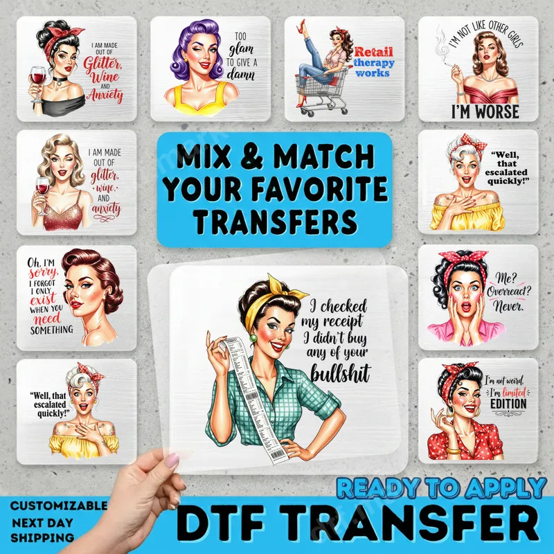 See allDive into retro charm with a modern, unapologetic twist. This vibrant DTF transfer features a classic pin-up girl character holding a lengthy receipt, accompanied by the hilariously blunt phrase, "I checked my receipt I didn't buy any of your bullshit." It's a ready to press design that perfectly blends vintage aesthetics with contemporary sassy humor, making a bold statement wherever it's applied. This unique heat press transfer is ideal for anyone who appreciates a good laugh and isn't afraid to speak their mind. Perfect for friends with a sarcastic sense of humor, independent women, or anyone looking to add some personality to their wardrobe. It makes a fantastic gift for birthdays, bachelorette parties, or just because you want to spread some defiant cheer. Applying this apparel transfer is straightforward. It works beautifully on a wide variety of materials, including cotton, polyester, and their blends. For best results, use a heat press at 300-325°F for 15 seconds with medium, even pressure. No need for tedious weeding, unlike traditional vinyl transfers, simply press and peel! Crafted with professional-grade DTF film, this iron on transfer guarantees exceptional quality. Expect vibrant colors that pop, a soft-to-the-touch feel, and outstanding durability that resists cracking and fading after multiple washes. Transform ordinary garments into extraordinary statement pieces with ease and confidence.