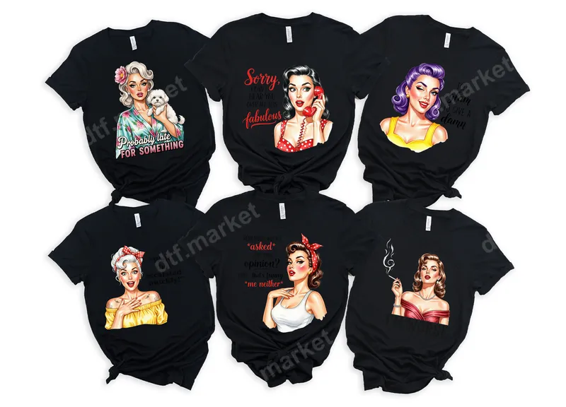 See allDiscover our vibrant collection of DTF transfers featuring sassy retro pin-up style women. Each design showcases a unique pin-up character paired with a witty, humorous quote, such as "Probably late for something" or "Sorry, I can't hear you over all this fabulous." These ready to press designs blend classic vintage aesthetics with modern, cheeky humor, perfect for adding playful personality to any garment or accessory. These heat press designs are ideal for women who love vintage charm, embrace their sassy side, or appreciate a good laugh. They make excellent gifts for birthdays, Galentine's Day, or "just because" for friends, sisters, and moms. Perfect for personalizing casual wear for girls' nights, themed parties, or simply expressing unique style. Crafters and DIY enthusiasts searching for popular iron on decals will love these custom projects. Our high-quality heat transfers are designed for easy application using both professional heat presses and household irons. They adhere beautifully to various fabrics, including cotton, polyester, and blends. Enjoy the convenience of a ready to press transfer with no weeding or layering needed. For best results, press at 300-325°F for 15 seconds with medium pressure, cold peel, then press again for 5 seconds for a flawless finish. Experience superior quality with these premium direct to film transfers. Each t-shirt transfer boasts vibrant, long-lasting colors and exceptional durability, resisting cracks and fading even after many washes. The soft-touch finish ensures comfort on any apparel. Crafted with professional DTF film and a strong, flexible adhesive, these custom transfers guarantee a professional-grade result that looks and feels fantastic.