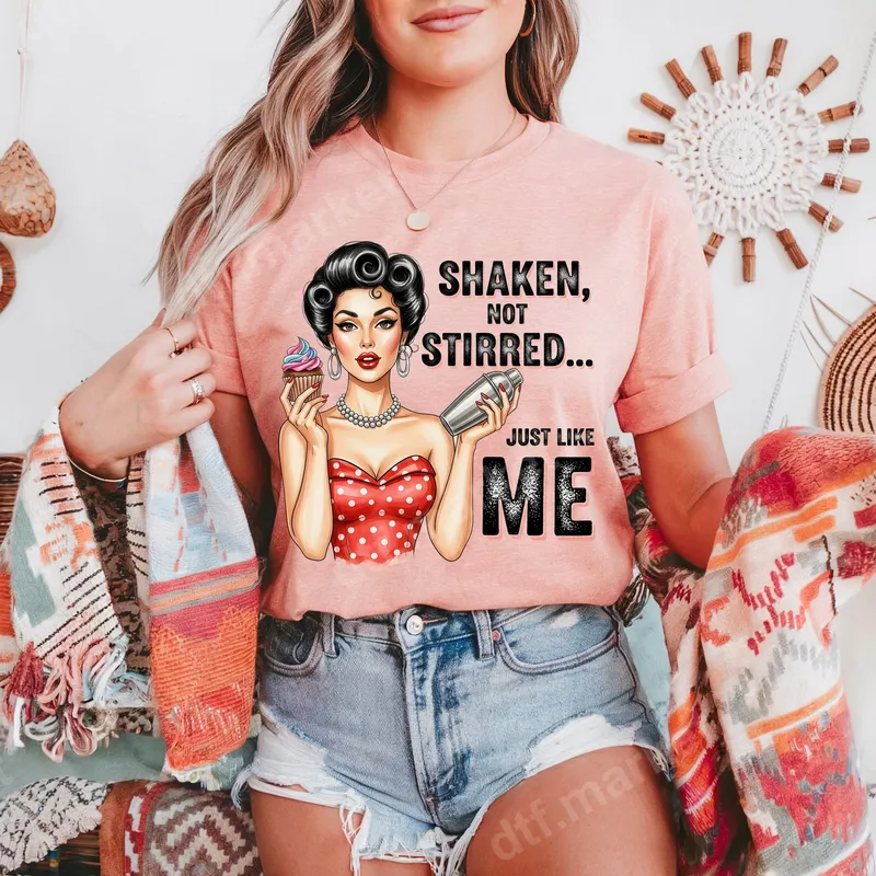 See allThis vibrant DTF transfer features a classic pin-up style woman exuding sass and charm, holding both a delicate cupcake and a sleek cocktail shaker. With the playful phrase 'Shaken, Not Stirred... Just Like Me,' this design captures a retro, confident, and fun-loving spirit. It's a high-quality, ready to press transfer that brings instant personality to any garment. Ideal for anyone who loves vintage aesthetics, enjoys a good cocktail, or appreciates a sassy statement. This unique heat transfer makes a fantastic gift for birthdays, bachelorette parties, girls' nights out, or a fun treat for yourself. Perfect for bartenders, bakers, or anyone with a bold and fun personality, ready to rock a custom shirt design. Our apparel transfer is incredibly versatile, designed for seamless application on a wide range of fabrics, including cotton, polyester, and their blends. For best results, use a heat press at 300-325°F for 15 seconds with medium pressure. A household iron can also be used. Enjoy the convenience of a ready to press transfer with no tedious weeding required, making customization quick and easy. Experience superior quality with our professional-grade DTF transfer. These direct to film transfers boast incredibly vibrant colors that pop, excellent wash durability, and a soft, flexible feel that won't crack or peel. Each iron on decal is produced with strong adhesive on premium DTF film, ensuring a long-lasting, high-definition finish that looks professionally applied.