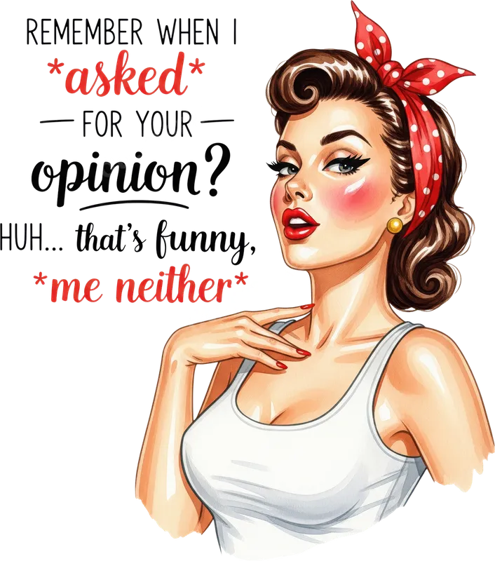 See allThis bold DTF transfer features a stunning, classic pin-up style woman with a confident smirk, vibrant red lips, and a playful polka-dot bandana. Accompanying her sassy expression is the witty phrase, "REMEMBER WHEN I asked FOR YOUR opinion? HUH... that's funny, me neither." This design perfectly captures a retro, empowered vibe for anyone ready to make a statement. It's a high-quality, ready to press transfer that brings instant personality to any garment. This unique heat press design is ideal for strong, independent women who appreciate vintage aesthetics and a good laugh. It's a fantastic choice for personalizing apparel for casual outings, girls' nights, or as a fun, empowering gift for friends and family. Perfect for birthdays, bachelorette parties, or just because, this design is sure to spark conversations and showcase a playful, no-nonsense attitude. Our direct to film transfers are incredibly versatile, adhering beautifully to a wide range of fabrics including cotton, polyester, and various blends. Application is simple: use a heat press at 300-325°F for 15 seconds with medium, even pressure. Unlike traditional vinyl transfer, there's no tedious weeding required. For home crafters, a household iron can also be used with careful application. You'll love the professional quality of this apparel transfer. Expect vibrant colors that pop, superior stretch and crack resistance for long-lasting wear, and a soft, smooth feel on your finished garment. Each custom transfer is printed on premium DTF film with strong adhesive, ensuring your design adheres flawlessly and stands up to countless washes. Elevate your wardrobe with a durable and stunning shirt design.