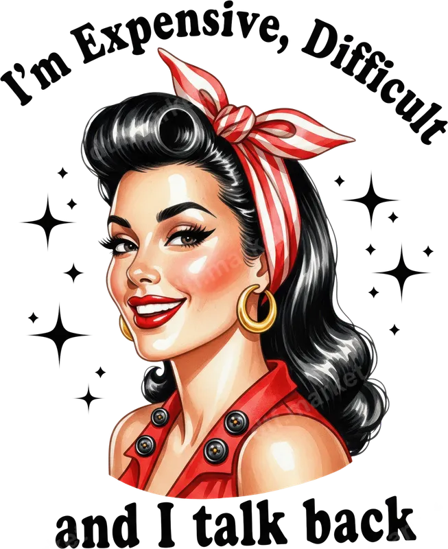See allEmbrace your confident side with this vibrant DTF transfer featuring a classic pin-up girl. Her charming smile, retro bandana, and bold statement 'I'm Expensive, Difficult and I talk back' convey undeniable attitude. This eye-catching direct to film transfer is ready to press, perfect for adding retro charm and personality to any garment. Crisp colors ensure a standout design for those who love to express their outspoken self. This sassy heat press design is ideal for women who appreciate humor and strong independence. It makes a fantastic gift for friends, sisters, or any powerful woman in your life for birthdays or just because. Perfect for casual wear, social events, or making a statement, this iron on transfer empowers with confidence. If you love vintage style or witty apparel, this design offers unique flair. Our premium heat transfer works flawlessly on various fabrics, including cotton, polyester, and blends. For optimal results, apply with a heat press at 300-325°F for 15 seconds with medium pressure, then cold peel. A household iron can also be used. This ready to press transfer eliminates tedious weeding, allowing you to create custom apparel effortlessly and quickly. Experience superior quality with our durable t-shirt transfers. Each design features vibrant, crack-resistant colors that remain vivid wash after wash. The finished heat press transfer is incredibly soft to the touch, providing comfortable wear. Crafted with professional-grade DTF film and strong adhesive, these transfers are engineered for longevity and a high-quality finish, making your custom projects look professional.