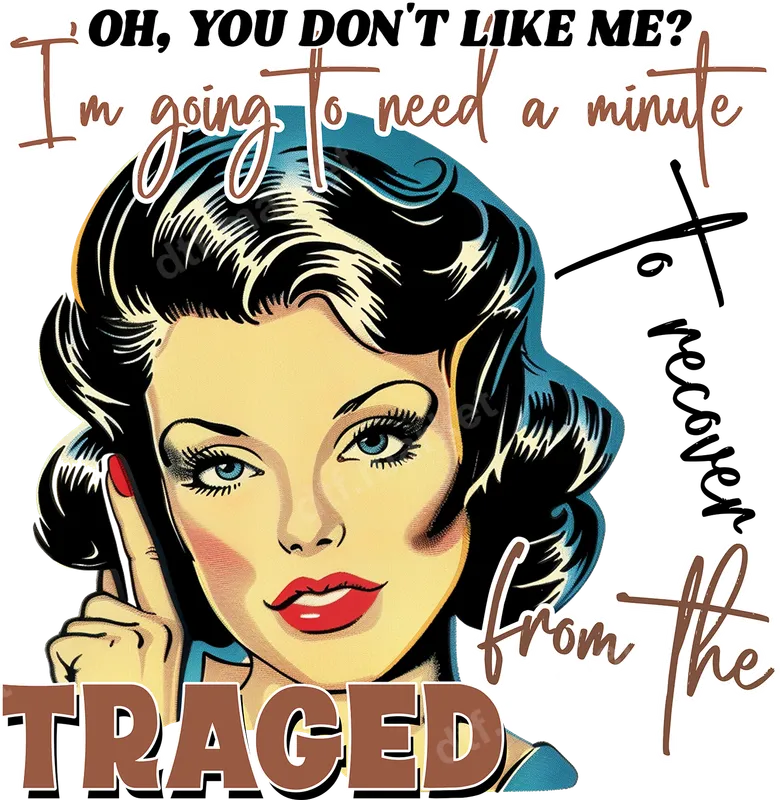 See allMake a bold statement with our 'Oh, You Don't Like Me? I'm going to need a minute to recover from the TRAGED' DTF transfer. This hilarious design features a classic pop art style woman, looking unimpressed and delivering a sarcastic comeback. It's a fantastic ready to press graphic combining retro charm with modern sass, ideal for those who appreciate humor and vintage aesthetics. This humorous heat transfer is ideal for anyone who loves retro fashion, sarcastic humor, or simply enjoys making a statement. It makes a fantastic gift for friends with a strong personality, a fun addition to a girls' night out, or a unique piece for casual wear. Perfect for social gatherings, gag gifts, or just adding attitude to your everyday wardrobe. Applying this high-quality iron on design is incredibly easy. Our heat press transfers are compatible with cotton, polyester, and blends, ensuring versatility for your projects. For best results, use a heat press at 300-325°F for 15 seconds with medium pressure. It can also be applied with a household iron, making it accessible for everyone, with no weeding required. Experience premium quality with our durable t-shirt transfer. Each design is printed with vibrant, long-lasting colors on professional-grade DTF film, ensuring your apparel will stand out. These transfers are crack-resistant, offer excellent wash durability, and have a soft-to-touch feel once applied. Enjoy a professional-looking garment that expresses your unique style.