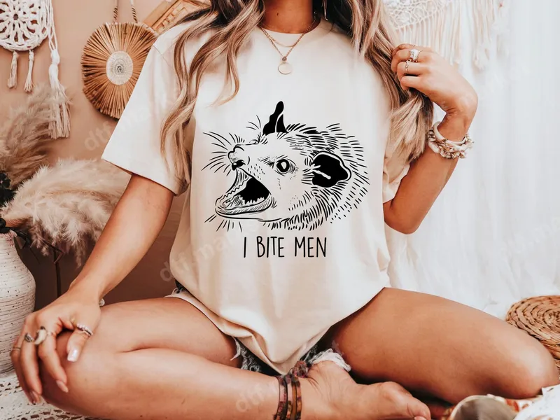 See allThis eye-catching DTF transfer features a detailed, hand-drawn style illustration of a possum with its mouth wide open, teeth bared, exuding a fiercely sassy attitude. Below the striking animal portrait, the bold text "I BITE MEN" delivers a clear, humorous, and empowered message. This ready to press design is perfect for anyone looking to make a statement with a touch of wild wit and sarcastic charm. This unique design is ideal for individuals who love animals, embrace their sassy side, and appreciate a good dose of edgy humor. It makes an excellent gift for friends, sisters, or anyone who enjoys standing out with a playful yet assertive vibe. Perfect for casual outings, girls' nights, or simply as an everyday statement piece, this transfer adds personality to any wardrobe. Applying this design is a breeze, making it a fantastic heat press transfer for DIY enthusiasts and small businesses alike. It works wonderfully on a wide range of materials, including cotton, polyester, and various blends. Simply apply with a heat press at 300-325°F for 15 seconds with medium pressure. The best part? There's absolutely no weeding required, making it much simpler than traditional vinyl transfer methods, and it's also a great iron on transfer option for careful application. Crafted from professional-grade DTF film, this apparel transfer ensures exceptional quality. Expect vibrant, crisp details that remain crack-resistant and soft to the touch, even after multiple washes. The strong adhesive guarantees a long-lasting finish, providing a durable and professional look for all your customized garments and accessories. Elevate your style with a high-quality shirt design that truly lasts.
