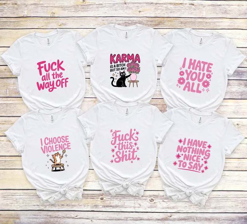 See allDive into our collection of sassy and unapologetically humorous DTF transfers, perfect for expressing your bold personality. Featuring playful pink fonts and edgy phrases like "Karma is a Bitch But So Am I" with a black cat, "I Choose Violence" with a mischievous tiger, or the straightforward "Fuck This Shit," these designs are ready to press onto your favorite garments. Each DTF transfer is meticulously crafted to deliver vibrant colors and sharp details, ensuring your statement stands out. These edgy designs are tailor-made for those with a sarcastic streak, cat lovers with attitude, or anyone who appreciates adult humor. They make hilarious gifts for friends, unique additions to bachelorette party swag, or simply a way to add some punch to your everyday wardrobe. Perfect for casual outings, social gatherings, or just lounging at home, these ready to press transfers let you wear your mood on your sleeve. Applying your new apparel transfer is a breeze. Our high-quality heat transfers work flawlessly with cotton, polyester, and most fabric blends. For best results, use a heat press at 300-325°F for 15 seconds with medium pressure, then cold peel the film. A household iron can also be used with careful application. Forget about tedious weeding; these iron on transfers are delivered precisely cut and ready for immediate application, making customization quick and easy. Experience the superior quality of our heat press designs. Our direct to film transfers boast exceptional durability, resisting cracks and peels even after multiple washes. The vivid colors remain true, and the finish is soft to the touch, not stiff or bulky like traditional vinyl transfer options. Elevate your custom t-shirt game with professional-grade shirt designs that look great and last long.
