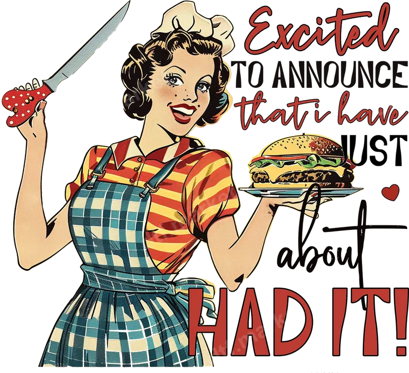 See allThis vibrant DTF transfer features a retro housewife with a mischievous grin, holding a burger and a large kitchen knife. The bold text declares, "Excited TO ANNOUNCE that i have JUST about HAD IT!" This hilarious ready to press design combines vintage charm with a sassy attitude, making it an instant conversation starter and the perfect way to express everyday exasperation. This humorous heat press transfer is ideal for anyone with a sarcastic sense of humor, especially busy moms, exasperated homemakers, or those feeling overwhelmed by daily life. It makes a fantastic gift for Mother's Day, birthdays, or just because. Show off your playful side at casual gatherings, family events, or while running errands. It’s also perfect for vintage lovers who appreciate retro wit. Applying this high-quality iron on decal is simple and efficient. Our direct to film transfer works beautifully on a wide range of fabrics, including cotton, polyester, and various blends. For best results, use a heat press at 300-325°F for 15 seconds with medium pressure, then perform a cool peel. No tedious weeding or layering – simply press and go! For household irons, ensure even, firm pressure without steam. Experience professional-grade results with our durable t-shirt transfer. The colors are incredibly vibrant, resistant to cracking, and leave a soft, flexible feel on your garment. Each design is printed on premium DTF film with a strong, reliable adhesive, ensuring your custom transfer lasts wash after wash. Transform ordinary apparel into extraordinary statements with a design that endures.