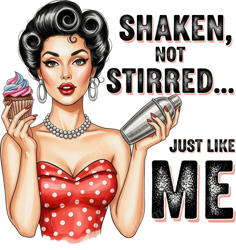 See allThis vibrant DTF transfer features a glamorous retro pin-up girl, exuding confidence and sass. With her perfectly coiffed hair, a string of pearls, and a polka-dot dress, she holds both a tempting cupcake and a classic cocktail shaker. The bold text "SHAKEN, NOT STIRRED... JUST LIKE ME" makes a witty statement, capturing a fun and empowered attitude. This ready to press design brings vintage charm and modern flair to any garment. This eye-catching heat transfer is perfect for anyone who loves retro aesthetics, enjoys a good cocktail, or simply embodies a confident, playful spirit. It's an ideal choice for ladies' nights out, bachelorette parties, birthdays, or just adding a touch of personal flair to your everyday wardrobe. Makes a fantastic gift for friends, sisters, or anyone who appreciates vintage style and a bit of sassy humor. Applying this high-quality iron on transfer is simple and efficient. It adheres beautifully to a wide range of fabrics including cotton, polyester, and various blends. For best results, use a heat press at 300-325°F for 15 seconds with medium, even pressure. Unlike traditional vinyl transfer designs, there's no weeding required – just press and peel. A household iron can also be used with careful application for smaller designs. Our apparel transfers are crafted using professional DTF film and inks, ensuring exceptional vibrancy, crisp details, and a soft, comfortable feel. The durable transfer resists cracking and fading, maintaining its stunning appearance wash after wash. This premium direct to film transfer provides a long-lasting, high-quality finish that looks professionally applied, ready to make a statement wherever you go.
