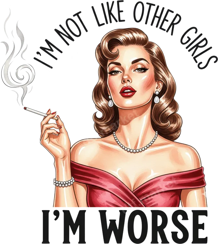 See allThis "I'm Not Like Other Girls, I'm Worse" DTF transfer features a glamorous, retro pin-up woman with a confident pose and a lit cigarette. Merging vintage style with a bold, sarcastic quote, this ready to press transfer is perfect for expressing a sassy attitude. It’s an eye-catching design that combines classic allure with modern, edgy humor, ensuring your apparel stands out. Ideal for anyone with a strong personality and a love for witty, unconventional humor. This design makes a fantastic gift for friends, sisters, or anyone who embraces their unique self. Perfect for casual outings, themed events, girls' gatherings, or simply adding a touch of rebellious chic to your everyday shirts, hoodies, or tote bags. This easy-to-apply heat press transfer works flawlessly on cotton, polyester, and blends. For professional results, apply with a heat press at 300-325°F for 15 seconds, medium pressure, then cold peel. A household iron can also be used. Forget the tedious weeding of vinyl transfers – our heat press ready designs offer a smooth, professional finish with minimal effort. Experience superior quality with our direct to film transfers. The vibrant colors are designed to be crack-resistant, fade-proof, and exceptionally soft to the touch, ensuring comfort and longevity. Made with professional-grade DTF film and robust adhesive, this apparel transfer promises a durable, high-quality application that will endure countless washes and wear.