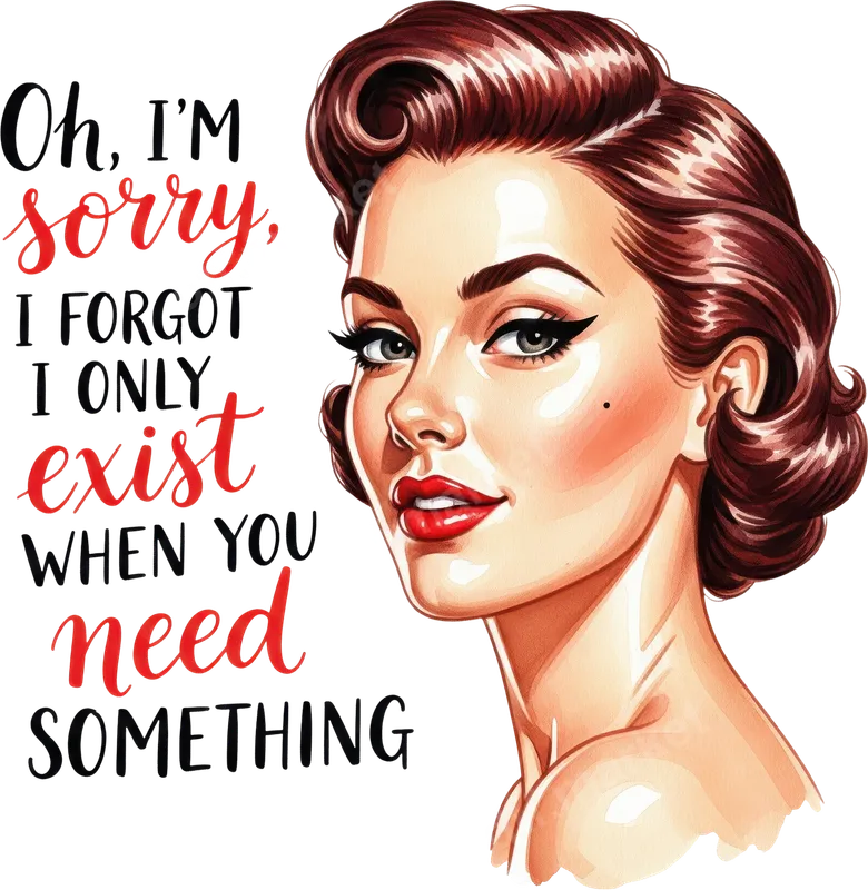 See allThis eye-catching DTF transfer features a beautifully illustrated retro pin-up style woman with perfectly coiffed hair and a knowing, sassy expression. Beside her, the bold text declares, "Oh, I'M sorry, I FORGOT I ONLY exist WHEN YOU need SOMETHING," delivered with a clear, witty punch. This ready to press design perfectly captures a vintage aesthetic fused with modern, unapologetic attitude. Ideal for anyone with a sarcastic sense of humor or a love for retro glamour, this heat press design is perfect for making a bold statement. It's a fantastic gift for sassy friends, a standout addition to your own wardrobe, or a unique conversation starter for casual outings and girls' nights. Showcase your personality and your impeccable taste in vintage-inspired apparel with this witty graphic. Our premium iron on transfer is designed for easy application on a wide variety of fabrics, including cotton, polyester, and their blends. Simply use a heat press at 300-325°F for 15 seconds with medium pressure, then cold peel for a flawless finish. For those without a professional press, a household iron can also be used with careful application. Best of all, there's absolutely no weeding required, saving you time and effort. Experience the professional quality of our direct to film transfer. Each apparel transfer is crafted to be incredibly vibrant, crack-resistant, and soft to the touch, ensuring your design looks fantastic and lasts wash after wash. The professional-grade DTF film boasts a strong adhesive, providing excellent durability and a superior finish that makes it look like it was printed right into the fabric. Get this heat press ready design and elevate your custom apparel game!