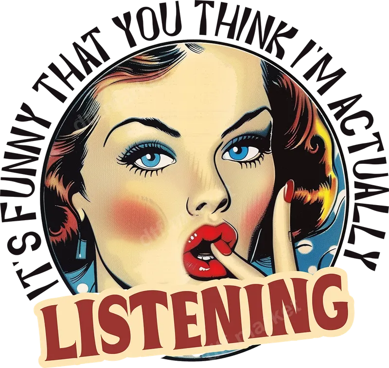 See allThis vibrant DTF transfer showcases a classic pop art woman with her finger to her lips, playfully conveying a secret or subtle sarcasm. The bold text "IT'S FUNNY THAT YOU THINK I'M ACTUALLY LISTENING" encircles the image, creating a strong, humorous statement. This ready to press design blends a retro comic book aesthetic with modern wit, perfect for expressing your sassy side on any t-shirt transfer. This unique heat transfer is ideal for anyone who appreciates vintage art, sarcastic humor, or making a bold statement. It's an excellent choice for casual wear, social gatherings, or adding personality to your everyday outfits. This design also makes a fantastic gift for friends, family, or colleagues who love witty designs and aren't afraid to show their true feelings. Our high-quality heat press designs are incredibly versatile, ensuring easy application on a wide range of materials like cotton, polyester, and various blends. Achieve professional results with a heat press at 300-325°F for 15 seconds, medium pressure. A household iron can also be used for smaller projects. Best of all, there's absolutely no weeding required, making your customization quick and hassle-free. Experience superior quality with our DTF transfers. Each direct to film transfer features vibrant colors, exceptional detail, and a durable finish that resists cracking and peeling, looking fantastic wash after wash. The professional-grade DTF film provides a soft, flexible feel on the garment. With its strong adhesive, this ready to press transfer ensures a long-lasting bond, delivering a retail-quality finish every time.