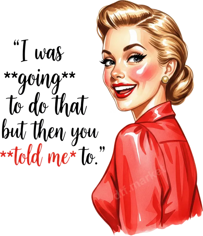 See allThis vibrant DTF transfer captures a classic retro pin-up woman with a knowing smile and the perfectly sarcastic quote, "I was going to do that but then you told me to." The design combines charming vintage art with modern sassy humor, making it an ideal ready to press design for anyone who appreciates a good witty comeback and a touch of old-school flair. The bold cursive text, with emphasis on "going" and "told me," stands out beautifully against any garment color, ensuring your statement is seen and understood. This heat transfer is perfect for individuals who love to express their personality with a bit of humor and attitude. It makes a fantastic gift for friends, sisters, moms, or anyone with a sarcastic streak and a love for retro aesthetics. Whether for a birthday, a casual get-together, or just to create a unique statement piece for everyday wear, this iron on transfer is sure to spark conversations and smiles. Customize apparel for girls' trips, casual outings, or simply to add some fun to your wardrobe. Our direct to film transfer is incredibly easy to apply, working seamlessly with cotton, polyester, and various fabric blends. For best results, use a heat press at 300-325°F for 15 seconds with medium pressure. It can also be applied with a household iron with careful, even pressure. Unlike traditional vinyl transfer, there's no weeding required, making your DIY apparel projects quicker and hassle-free. Just press, peel, and wear your unique creation! Experience professional-grade quality with this apparel transfer. Each design is printed with vibrant, long-lasting inks on durable DTF film, ensuring your finished garment remains crack-resistant, peel-free, and soft to the touch even after multiple washes. This heat press design guarantees excellent adhesion and a flawless finish, making your custom shirts, hoodies, or tote bags look professionally made and ready to impress.