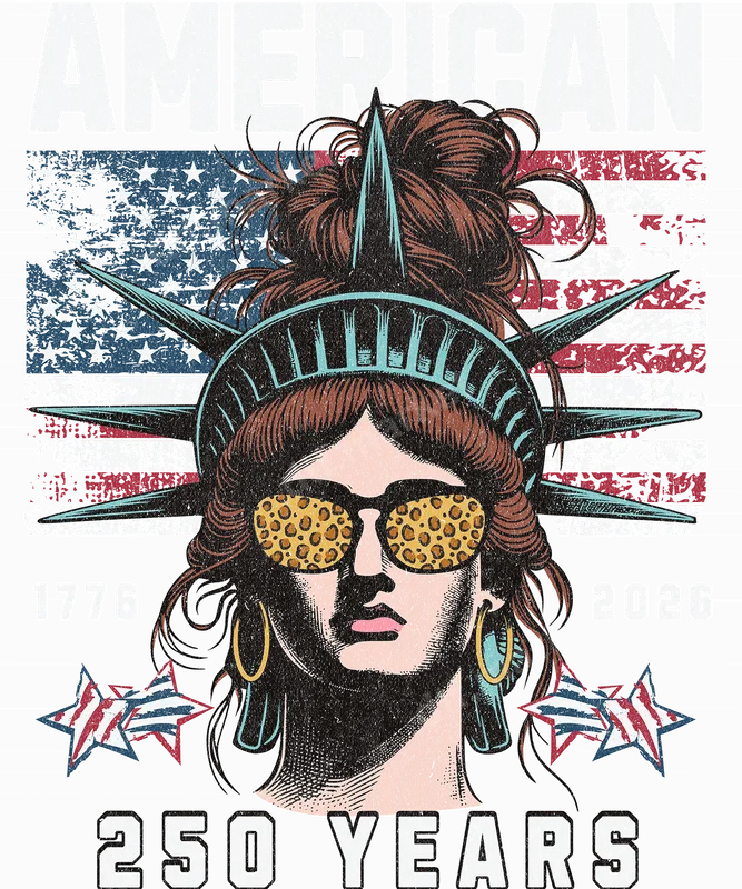 See allThis vibrant DTF transfer showcases a modern, sassy take on Lady Liberty, sporting a trendy messy bun, chic leopard print sunglasses, and hoop earrings, all set against a distressed American flag background. Commemorating the 250th anniversary of American independence from 1776 to 2026, this ready to press design is perfect for those who celebrate patriotism with a unique, edgy style. It's a high-quality heat transfer that brings a contemporary flair to any garment. This unique iron on transfer is ideal for patriotic women, trendsetting moms, and anyone looking to express their American pride with a touch of attitude. It makes a fantastic gift for Fourth of July celebrations, Memorial Day events, Veterans Day, or simply to show off your love for country year-round. Prepare for the upcoming 250th anniversary with a standout apparel transfer design. Applying this heat press transfer is straightforward and efficient. It works seamlessly on a wide range of materials including cotton, polyester, and various fabric blends. For best results, use a heat press at 300-325°F for 15 seconds with medium pressure, then peel cold. If you don't have a heat press, a household iron can also be used following careful instructions. No tedious weeding is required, saving you time and effort. Our direct to film transfer is produced using professional-grade DTF film, ensuring vibrant colors that pop and a soft hand feel that won't crack or fade after washing. Each shirt design is crafted for durability and longevity, featuring strong adhesive properties that bond securely to your chosen garment. Enjoy a professional-quality finish that looks and feels premium.