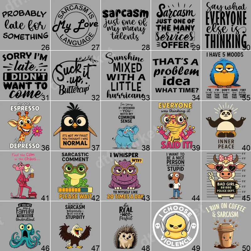 See allUnleash playful rebellion with our 'I Choose Violence' DTF transfer! This vibrant design features an adorably angry yellow chick clutching two knives, surrounded by bold white text. It's a perfect blend of cute and edgy, making a hilarious statement. This high-quality direct to film transfer is ready to press onto your favorite apparel, bringing sarcastic charm. Ideal for anyone with a dark sense of humor, meme lovers, or those appreciating sarcastic jokes. This ready to press transfer makes an excellent gift for friends, family, or yourself, for birthdays, casual outings, or everyday wear. Stand out at parties, gatherings, or make a statement. It’s perfect for adding a unique touch to your wardrobe or creating custom iron on transfers that get a laugh. Applying this heat press design is a breeze! Our heat press ready transfer works perfectly on cotton, polyester, and various blends. For best results, use a heat press at 300-325°F for 15 seconds with medium pressure. It can also be applied with a household iron. Say goodbye to tedious weeding – this apparel transfer is ready to go straight from film to fabric! Experience superior quality with our durable and vibrant DTF transfer. Colors are vivid, ensuring your design pops and retains brilliance wash after wash. Our professional-grade DTF film offers excellent stretch and crack resistance, providing a soft, smooth feel that integrates beautifully. The strong adhesive ensures a long-lasting, professional finish, making your custom transfer look fantastic for years to come.