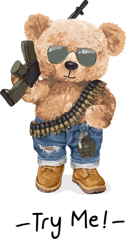 See allThis bold DTF transfer showcases an undeniably savage teddy bear, exuding a tough-guy attitude that's both humorous and edgy. Clad in cool aviator sunglasses, ripped jeans, and sturdy boots, this bear means business, armed with a rifle, a bullet bandolier, and a grenade. Below this formidable furball, the defiant text "—Try Me!—" adds a sarcastic punch, making this ready to press transfer perfect for anyone seeking to make a statement. Ideal for streetwear aficionados, those with a penchant for dark humor, or anyone injecting playful rebellion into their wardrobe. This design makes a fantastic gift for friends who appreciate edgy graphics, perfect for casual wear, or for standing out at parties and events. It’s a personality statement that says you're not to be messed with, all wrapped in an unexpectedly adorable package. Applying this vibrant heat press design is incredibly simple. Our high-quality iron on transfer works seamlessly on cotton, polyester, and their blends. Simply use a heat press at 300-325°F for 15 seconds with medium pressure. Unlike traditional vinyl, there's absolutely no weeding required, making it a quick, effortless way to customize your garments. A household iron can also achieve excellent results with careful application. Crafted from premium professional DTF film, this ready to press transfer guarantees superior durability and exceptional color vibrancy that resists cracking and fading wash after wash. The strong adhesive ensures a long-lasting bond, while the soft-to-touch finish provides maximum comfort. Elevate your t-shirt transfer projects with this unique heat press ready design, ensuring your custom creation looks and feels professional every time.