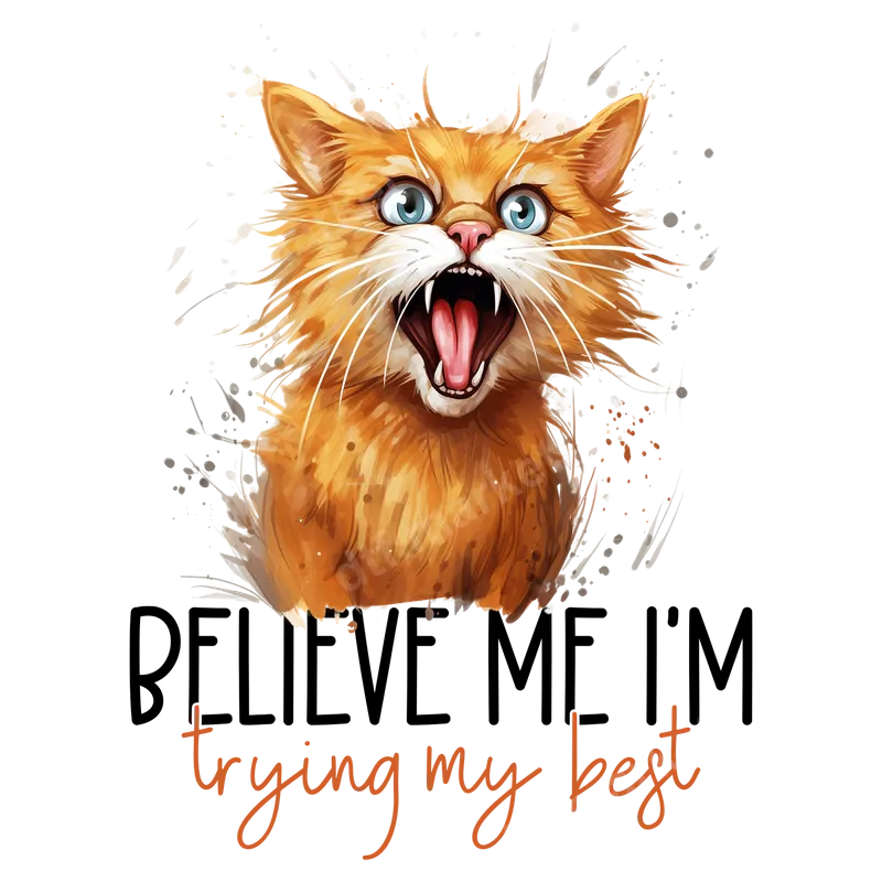 See allThis hilarious DTF transfer features an expressive, wide-eyed orange cat mid-scream, perfectly embodying the relatable sentiment 'BELIEVE ME I'M trying my best.' Rendered in a dynamic watercolor style with playful ink splatters, this ready to press design brings humor and personality. It transforms any blank into a statement piece about daily struggles with a smile. This unique heat transfer is ideal for cat lovers, humor enthusiasts, and anyone appreciating sarcastic wit. It makes a fantastic gift for friends, family, or yourself during stressful periods like exam season or busy work weeks. Apply this eye-catching t-shirt transfer to create custom apparel for casual outings, relaxed weekends, or as a funny conversation starter. Applying this vibrant design is straightforward, perfect for both beginners and experienced crafters. This iron on transfer works beautifully on a wide variety of fabrics, including cotton, polyester, and blends. Use a heat press at 300-325°F for 15 seconds with medium pressure, then peel warm or cold. For those without a professional heat press, a household iron can also be used. No tedious weeding or layering required! Crafted from professional-grade DTF film, this direct to film transfer ensures exceptional quality and durability. Colors are vibrant, sharp, and withstand numerous washes without cracking, peeling, or fading. You'll love the soft-to-touch feel once applied, seamlessly blending with the fabric. The strong adhesive ensures a lasting bond, creating professional-looking results.