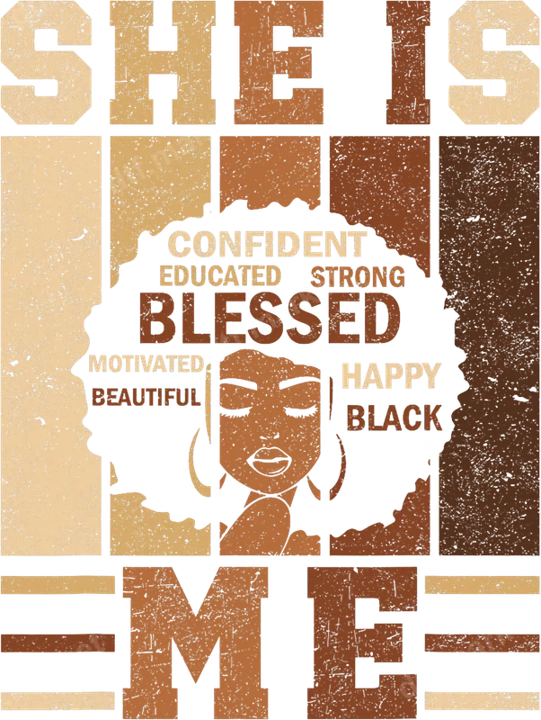 See allEmbrace identity and confidence with our striking "She Is Me" DTF transfer design. This powerful ready to press transfer features a stylized Black woman with her eyes closed, radiating peace and strength. Her voluminous afro is artfully formed from inspiring words such as "CONFIDENT," "EDUCATED," "STRONG," "BLESSED," "MOTIVATED," "BEAUTIFUL," "HAPPY," and "BLACK." The entire design is framed by bold, distressed block letters spelling out "SHE IS ME," all rendered in beautiful, earthy shades of brown and beige, giving it a unique vintage-yet-modern feel. This direct to film transfer is perfect for making a statement. This empowering heat transfer is ideal for anyone who wants to celebrate Black womanhood, self-love, and inner strength. It makes an incredible gift for mothers, sisters, daughters, or friends for birthdays, graduations, or just as a thoughtful gesture of encouragement. It's also a fantastic way to create custom apparel for Black History Month events, women's empowerment gatherings, or simply for everyday wear to inspire and uplift. Applying this iron on transfer is effortless, suitable for a wide range of fabrics including cotton, polyester, and their blends. For best results, use a heat press at 300-325°F for 15 seconds with medium pressure, then peel cold. If you don't have a heat press, a household iron can also be used with careful application. Say goodbye to tedious weeding or layering, as this heat press ready design comes in one easy-to-apply piece. Our professional DTF transfer film ensures vibrant, long-lasting colors that resist cracking and fading, even after multiple washes. The soft-touch finish integrates seamlessly with your garment, providing a comfortable and durable custom look. You'll love the quality and ease of transforming plain items into personalized expressions of pride and power with this premium apparel transfer.